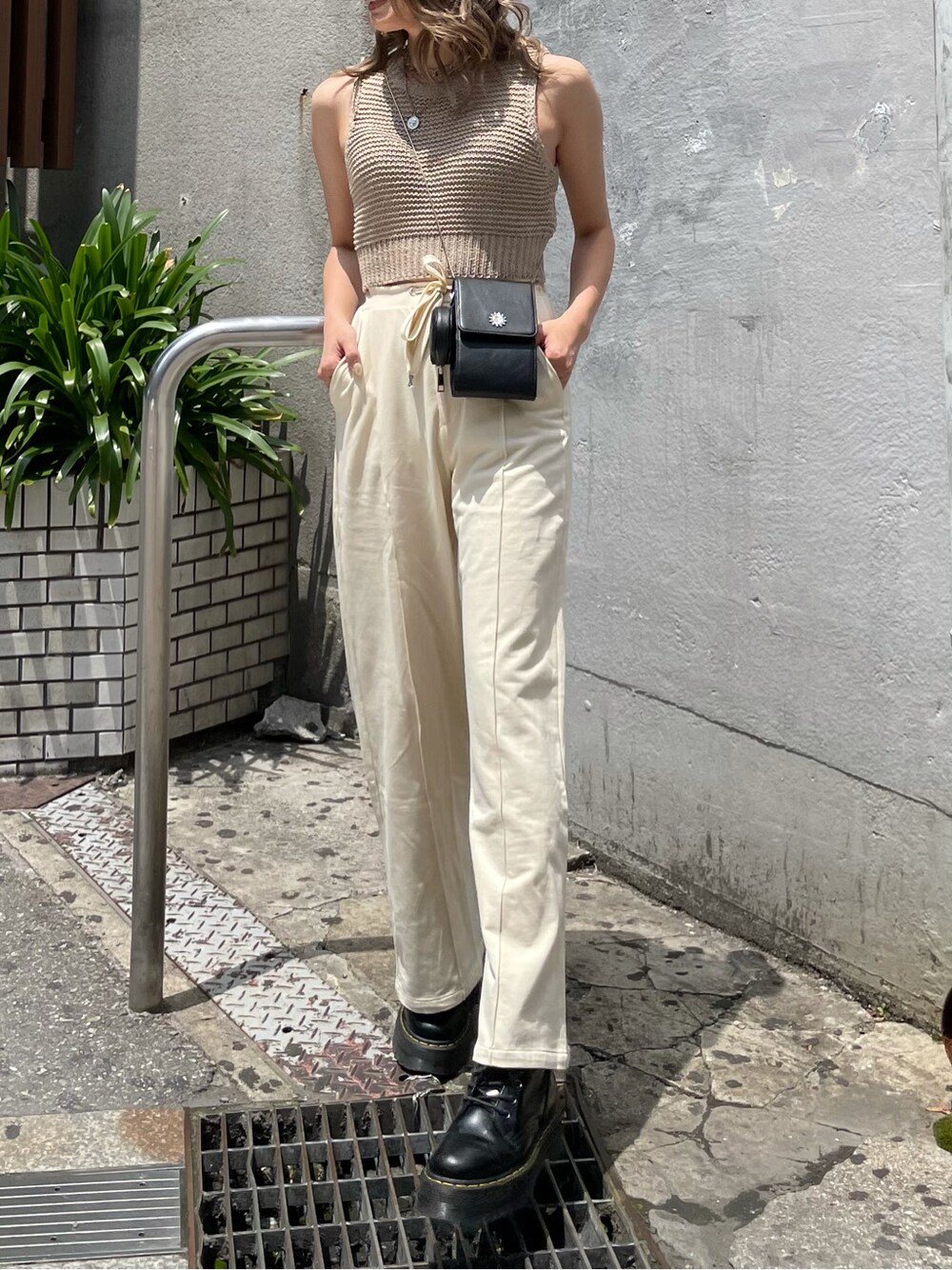 スウェットパンツの楽チンコーデ♡カジュアルなスウェットパンツにサラッと着れるニットタンクを合わせ夏っぽさを出したカジュアルコーデです☑︎ 【tops】リリヤーン糸を使っており、柔らかい着心地で軽量感もある、通気性もバッチリなニットタンクです♪透け感もほぼなく、インナーを気にしなくて大丈夫です☑︎(私はシンプルな下着着用してます)162cmでおへそ少し下ぐらいの丈感になってます✌︎ 【pants】ストレートシルエットが珍しいスウェットパンツは、センタープレスで縦のラインが強調されるので、履くだけで脚長効果抜群☑︎後ろはウエストゴムで、前紐で調節も出来るのでお好みのサイズ感で履いていただけます!裏地はミニ裏毛なので、サラッとした着心地で通気性もバッチリです♡162cmだとスニーカーでも合わせられるくらいの丈感です♡ミクロバックで綺麗めさを出し、アクセもEVRIS人気の3連ネックレスでワンポイント♪シンプルな合わせにはアクセも必須ですよね♡夏場にラフに着れるカジュアルコーデの完成です♪