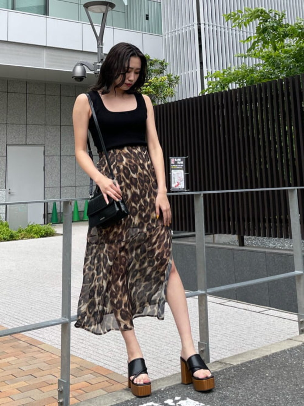 レオパード柄を使った夏コーデ♡ レオパード柄で存在感を出し、シンプルに綺麗めにまとめました♪スカートはスリットでチラッと肌見せでき、普段あまり肌見せをしない方にもオススメです♡シアー素材で程よく透け感もあり、透けすぎることなく涼しく着用出来ます✌︎162cmだと、インナーの長さは膝上15cmぐらいになってます☑︎ウエストゴムで楽チンな上に、ハイウエストなのでショート丈のTOPSとも合わせやすいです♡合わせたTOPSはバックスタイルが可愛く、リボンがワンポイントになっており、結び加減でウエストもスッキリ見せられます♪スクエアネックで首回りも広く、デコルテが綺麗に女性らしく着れるのもポイントです♡デザインのあるTOPSなので、シンプルにデニム合わせでもカジュアルに着れるのでオススメです☑︎サンダルも足首をしっかり出し、女性らしさのある厚底を合わせました♪アッパー部分も深めで脱げにくく、安定感もしっかりあります☑︎バッグはマチがしっかりで容量も抜群!マットな質感のクロコ柄なので綺麗めにも合わせやすく、ハンドでもショルダーバッグでも持てる2way仕様です☑