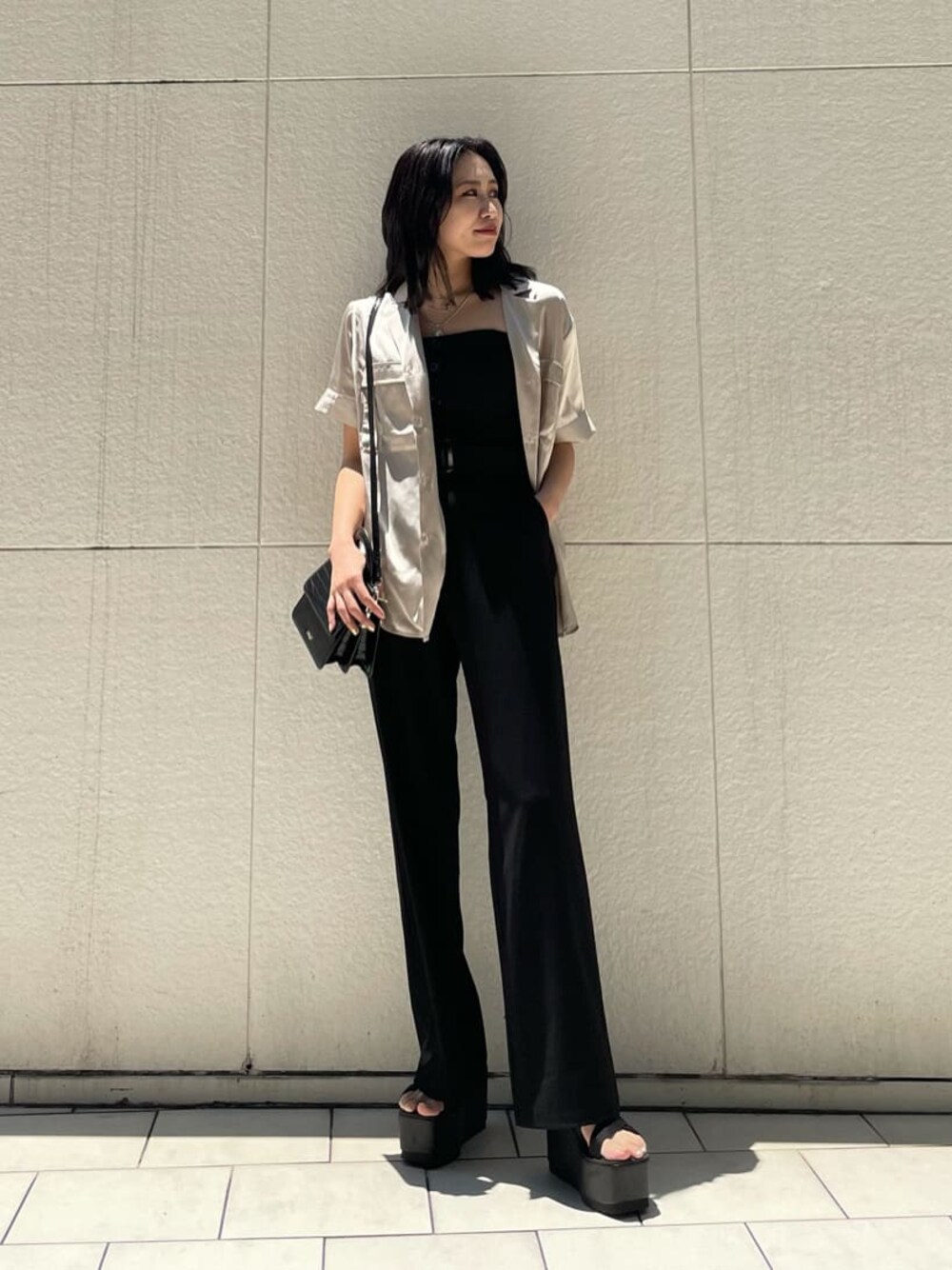 びっくりするほどスタイルアップ出来ちゃうオールインワンコーデ♡ ブラックベースにベージュのサテンシャツでかっこよくまとめました✌︎ 【オールインワン】ウエスト高め位置のベルトで脚長効果抜群!細身のパンツシルエットでスラッと見え、上半身はピタッとフィットするので女性らしいラインがしっかりと出るオールインワンです♡背中のギャザーと胸元のゴムがしっかり入っているので、ずり落ちる心配もないです☑︎インナーにTシャツなどを合わせてカジュアルに着るのもオススメです♪ 【シャツ】サテンシャツはヴィンテージライクな素材なので控えめな光沢感が綺麗めな印象を醸し出してくれます♡ゆったりシルエットで、162cmでもお尻が隠れるくらいの丈感なので、体型カバーも出来ちゃいます☑︎前ボタンを閉めてTOPSとしても着用出来る着回し万能シャツです♪ 【シューズ】厚底でしっかりスタイルアップでき、足全体をしっかり固定してくれるので安定感が抜群!傾斜もほぼ無いので1日歩いてても疲れにくい優秀サンダルです♡ 【バッグ】マットな質感なので、デザインがありつつ綺麗めにも持ちやすいです♪コンパクトですが、マチが広めで容量もしっかり入るのがオススメポイントです☑