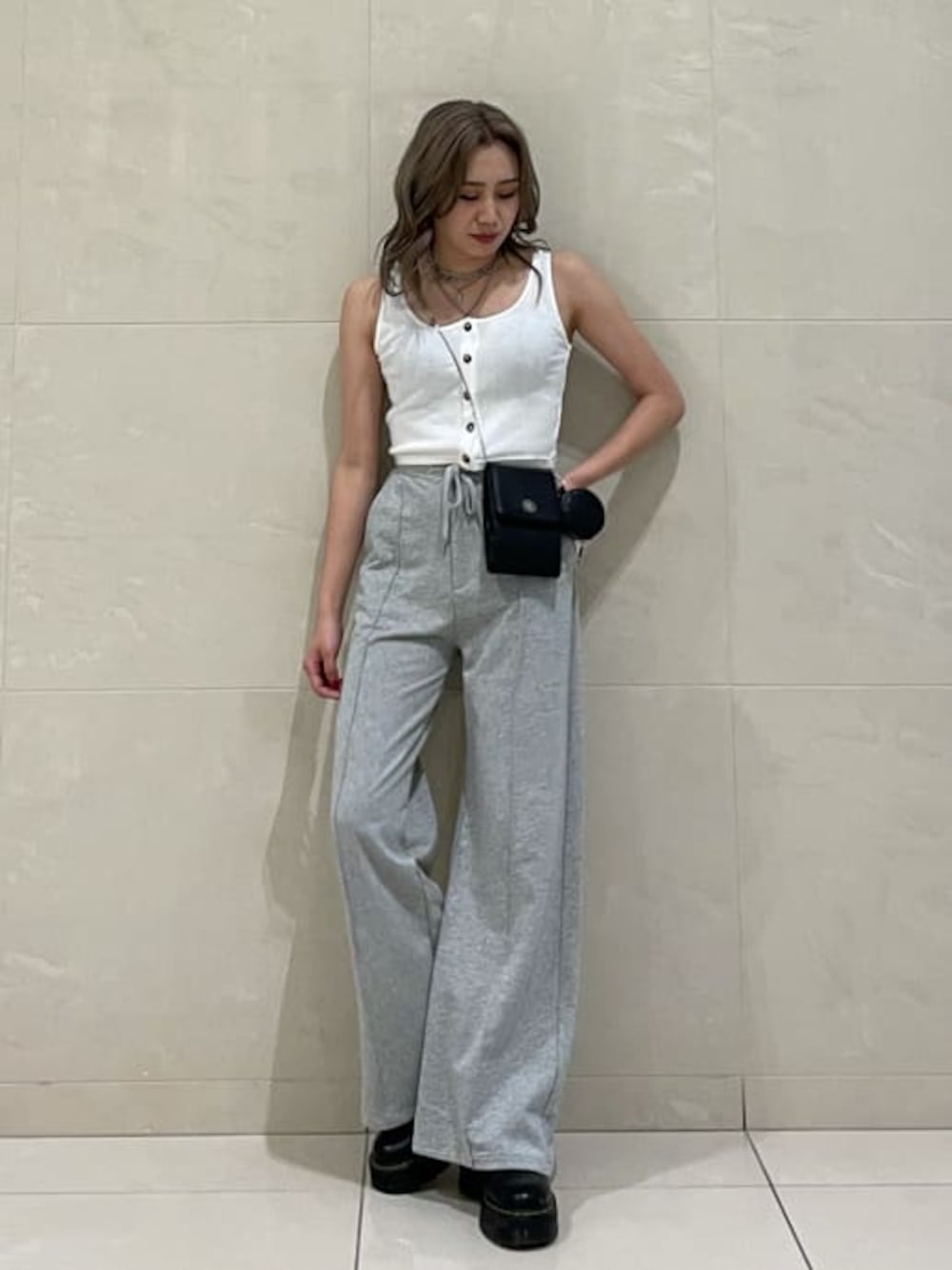 楽ちんシンプルコーデ♡ラクだけどスタイル良く見えるコーデにしました♪パンツはスウェット素材でゆったりなので凄くラクなのはもちろん、センタープレスで少し綺麗め要素もありカジュアルになりすぎないのが嬉しいポイントです♪ストレートシルエットでスッキリ見える上に、ハイウエストでスタイルアップも出来ちゃいます♡ハイウエストボトムなのでTOPSにはフィット感あるショート丈でバランスよく見えるように合わせました♪このタンク、生地感しっかりで白でも透けにくいのが優秀なんです☑︎シンプルコーデなので、存在感あるEVRIS定番の3連ネックレスでワンポイントお洒落感を出しました♡小物を黒で統一してグッとコーデを引き締めました♪