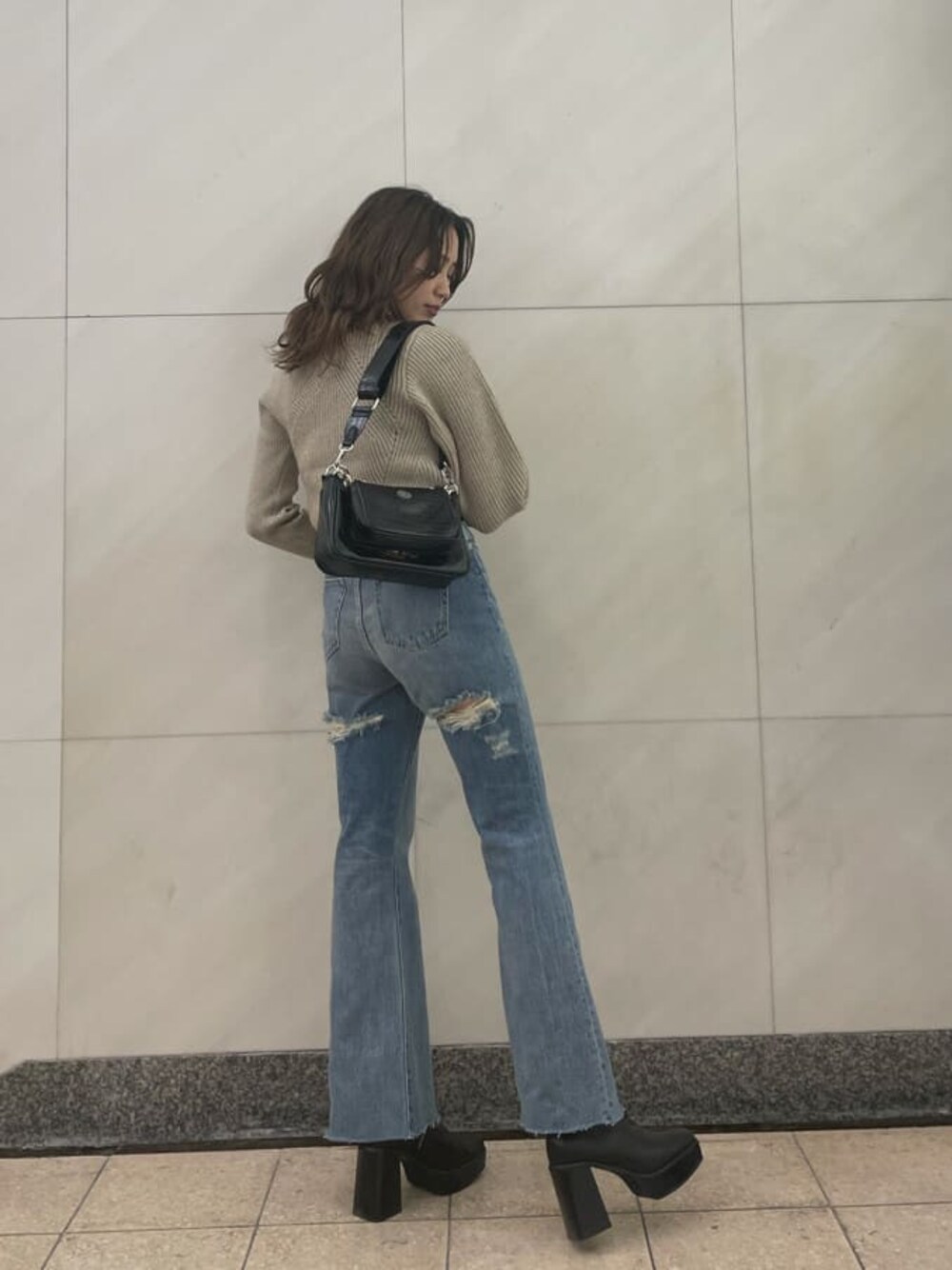 肌見せで抜け感を出したニット×デニムの王道カジュアルコーデ♡【knit】丈感違いのニットが2枚ドッキングされたお洒落ニット♡首元のワンポイントの肌見せが抜け感を出してくれ、首元が綺麗にスッキリ見えます♡首が詰まってるのが苦手な方にオススメの1着です☑︎左右の袖のデザインも違うので、着るだけでこなれ感が出せますよ♪【bottom】フレアシルエットで脚が細く長く見える優秀デニムです♪ハイウエストでポケット位置高めなのでヒップアップ効果もバッチリです!後ろのワンポイントダメージが可愛く、少し下の位置に入っているので下着が見える心配もありません☑︎162cmの私だとローヒール合わせもいけちゃいますよ♪【shoes】生地感が柔らかく、足首までピタッとフィットしてくれるので脚がすごくスッキリ見えます☑︎フィットしているおかげで安定感もより増すので本当に歩きやすいです♡厚底で傾斜もあまりないので、1日歩いても疲れにくく、スタイルアップまで叶っちゃいます♡