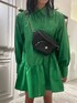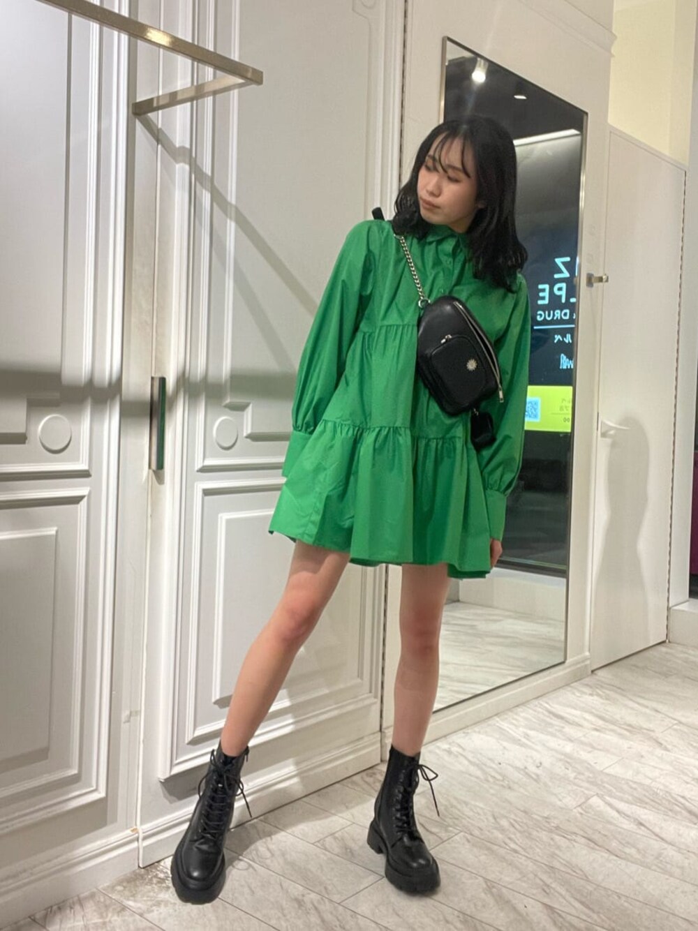 今季トレンドグリーンカラーで楽ちんワンピースコーデ♡ 【ワンピース】・裾広がりなシャツワンピなので足がすごく細見えします・フワッとして見えますが、シャツ素材で少しカジュアルな印象に◎・前ボタンなので羽織としても使えちゃいます【バッグ】・EVRISのボディバッグは肩紐が細身でチェーン仕様なのでカジュアルになりすぎません・小さいペットボトルはすっぽりはいります・チェーンの長さも調整可能・AirPodsケース付です【シューズ】・3cmほどのインソールが入っているのでしっかりスタイルアップできます・レースアップデザインですがサイドジップで着脱が簡単です・片足400gで超軽量、疲れにくいです