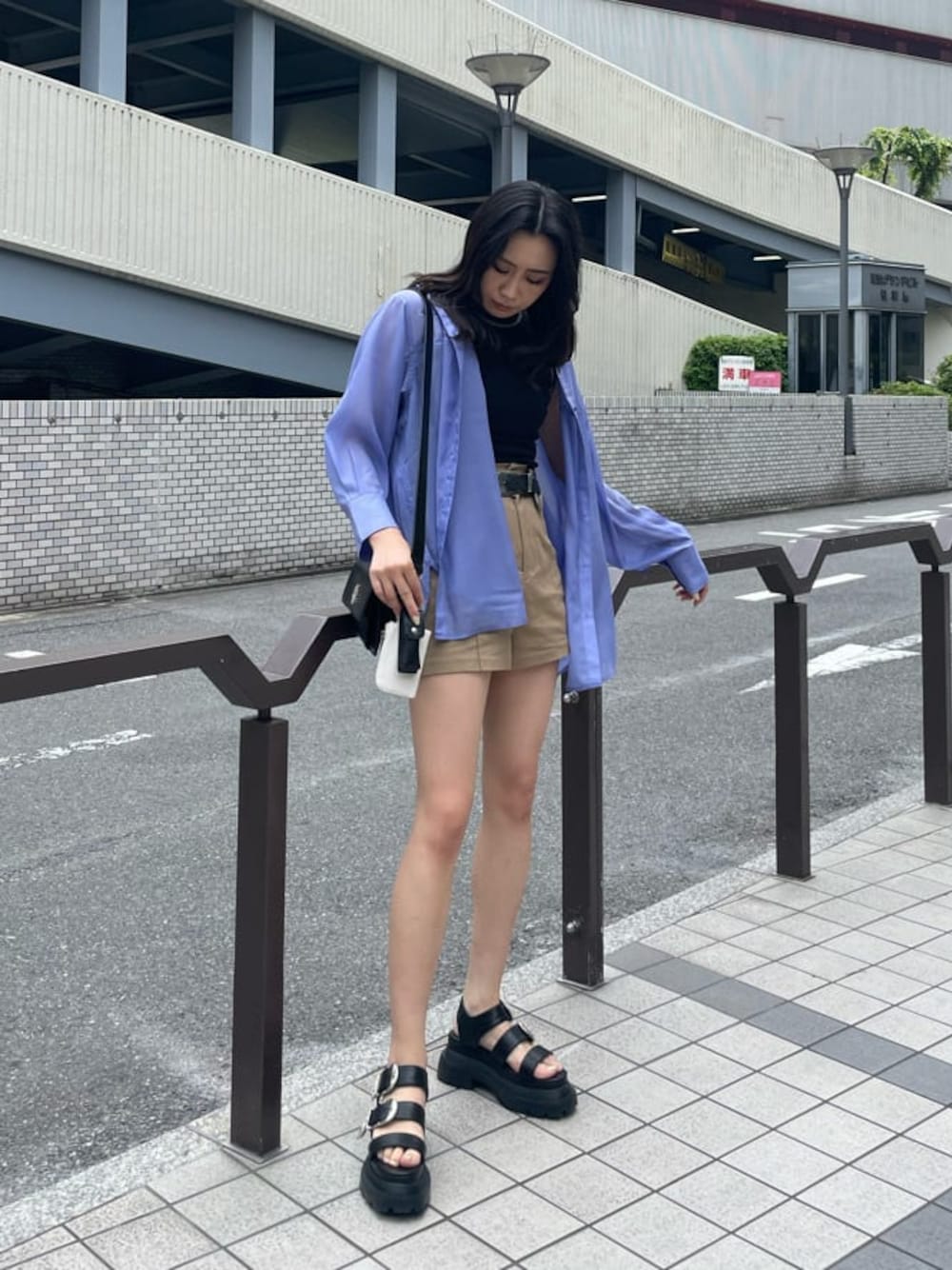 カラー×カラーで夏のお洒落見えコーデ♡ 【トップス】・ステッチがワンポイントで可愛いです・162cmでおへそ下ぐらいの丈感です【ボトム】・ハイウエストで脚長効果抜群です・伸縮性のある素材で動きやすさもバッチリです【シャツ】・程よく透け感があり真夏まで使えます・少し光沢感のある生地感です【バッグ】・ミニポーチが3つついていて見た目以上に中身が入ります・中には大きなポケット付きです・ミニポーチの配色が可愛いです【サンダル】・バックルデザインがEVRISらしい一足です・厚底でスタイルアップできちゃうのに楽ちんです・見た目以上に軽量で足も疲れにくいです【ベルト】・EVRIS大定番ベルトです・大きめバックルがコーデのワンポイントになります