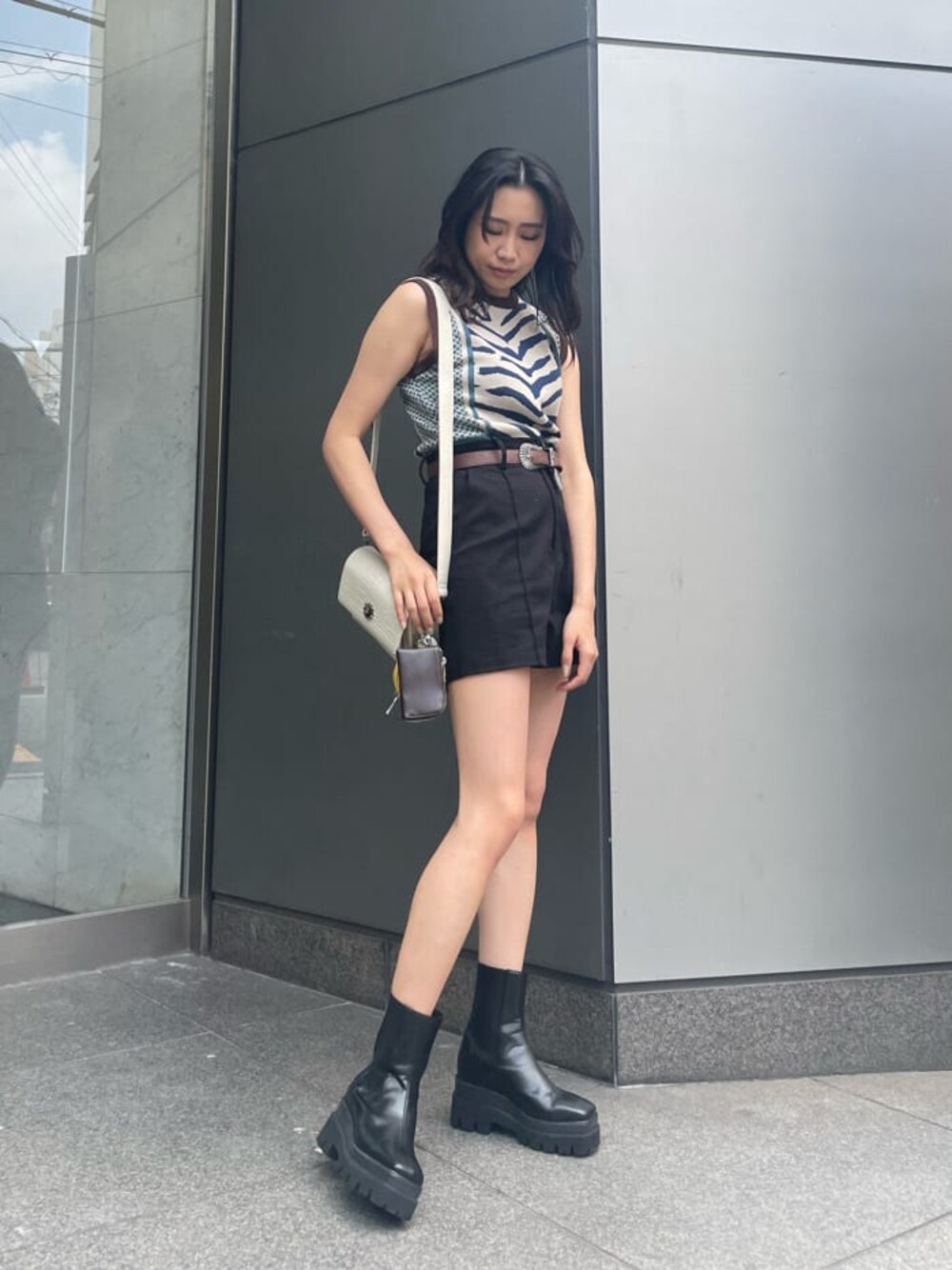 AKARI(EVRIS)のベルト「メタルバックルフェイクレザーベルト」を使ったコーディネート