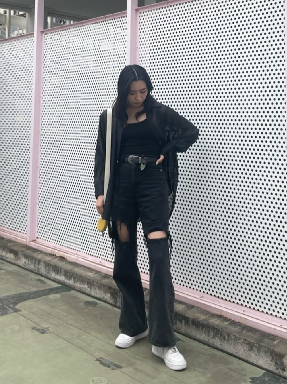 夏のブラックコーデ♡ 【シャツ】・程よく透け感があり真夏まで使えます・少し光沢感のある生地感です【キャミソール】・カップ付きで1枚で着れます・アジャスター付きで肩紐調整出来ます【デニム】・ダメージ位置高めで膝下が長く見えます・細身のワイドデニムでスッキリ見えます・膝上ダメージがしゃがんでも破れません【ベルト】・EVRIS大定番ベルトです・大きめバックルが存在感バッチリです【バッグ】・ミニポーチが3つついていて見た目以上に中身が入ります・中には大きなポケット付きです・ミニポーチの配色が可愛いです