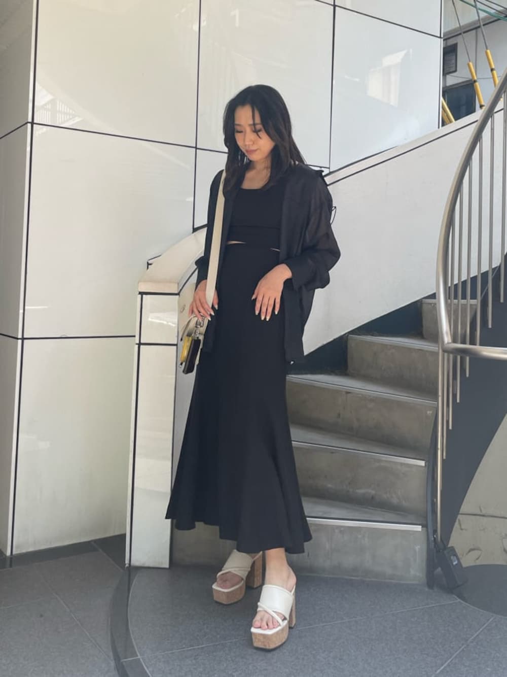 綺麗めブラックコーデ♡ 【シャツ】・程よく透け感があり真夏まで使えます・少し光沢感のある生地感です【キャミソール】・カップ付きで一枚で着用できます・肩紐調節可能です・しっかりした生地感で伸縮性があるので動きやすいです【スカート】・今季トレンドのマーメイドシルエットです・サラッとした生地で風に靡く素材です・162cmで足首が見える丈感です【サンダル】・昨年大人気だったサンダルのニューバージョンです・コルクデザインが他と被りにくいです・程よい傾斜でスタイルアップでき、クッション性もあり疲れにくいです【バッグ】・ミニポーチが3つついていて見た目以上に中身が入ります・中には大きなポケット付きです・ミニポーチの配色が可愛いです