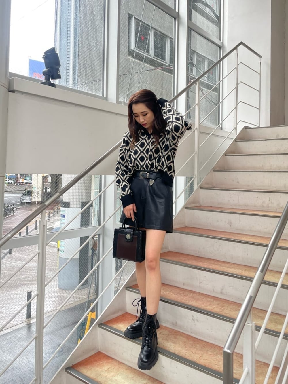 主役級柄ニットコーデ♡ 【ニット】・柔らかい触り心地で着心地ふわふわです・開襟デザインで首回りもスッキリ見えします【ボトム】・厚手すぎないフェイクレザーで年中使えます・ハイウエストで背中部分がゴムなので楽ちんです・ポケット4つ付きで機能性もバッチリです【バッグ】・バイカラーにサニーモチーフのEVRISらしいバッグです・外側と内側にポケットが付いていて機能性◎・ハンドでもショルダーでも使える容量抜群バッグです【ブーツ】・3cmほどのインソールが入っているのでしっかりスタイルアップできます・レースアップデザインですがサイドジップで着脱が簡単です・片足400gで超軽量、疲れにくいです【ベルト】・EVRIS定番ベルトです・大きめバックルがウエストマークしてくれてコーデのワンポイントになります
