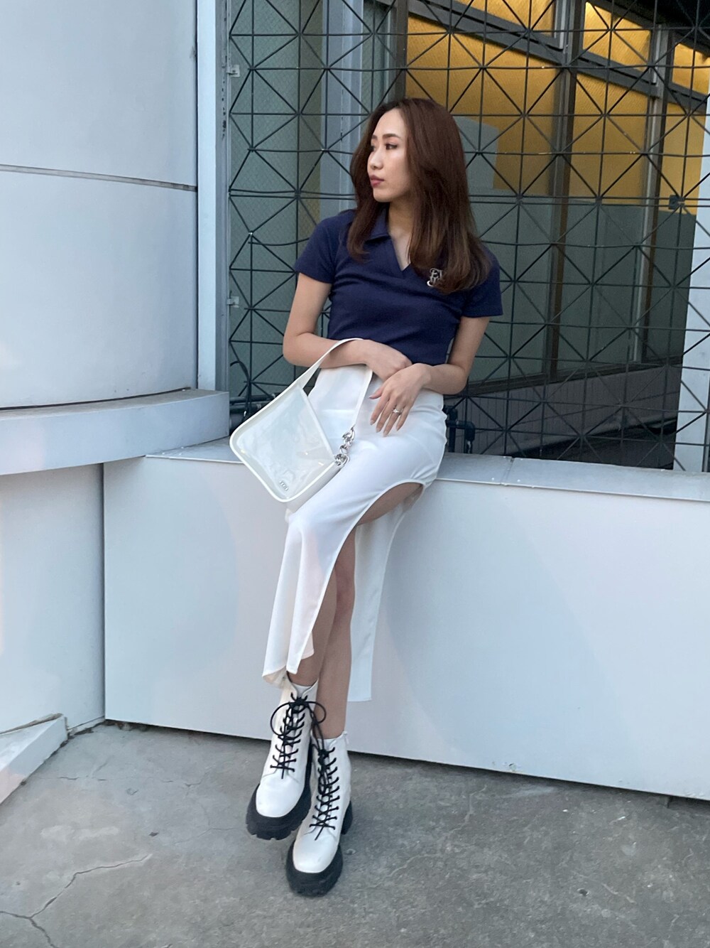 【トップス】・EVRISロゴが可愛いショート丈TOPS🫶首元もスッキリ見えます🤍【スカート】・スカートはインナーもついてますよ👍【バッグ】・クリア素材が春夏っぽさをプラスしてくれます🫶程よい透け感が使いやすいです!【ブーツ】・3cmほどのインソールが入っているのでしっかりスタイルアップできます・レースアップデザインですがサイドジップで着脱が簡単です・片足400gで超軽量、疲れにくいです