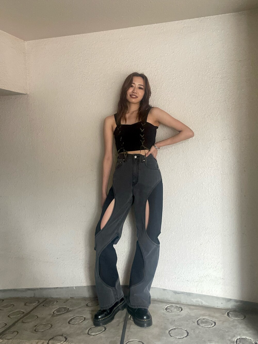 【トップス】・162cm着用です!レースアップデザインが可愛いです🫶【デニム】・他にはないデザインがオシャレ感でるワイドデニムです❤️肌見せが可愛く、存在感抜群です👍