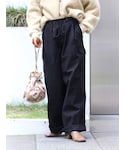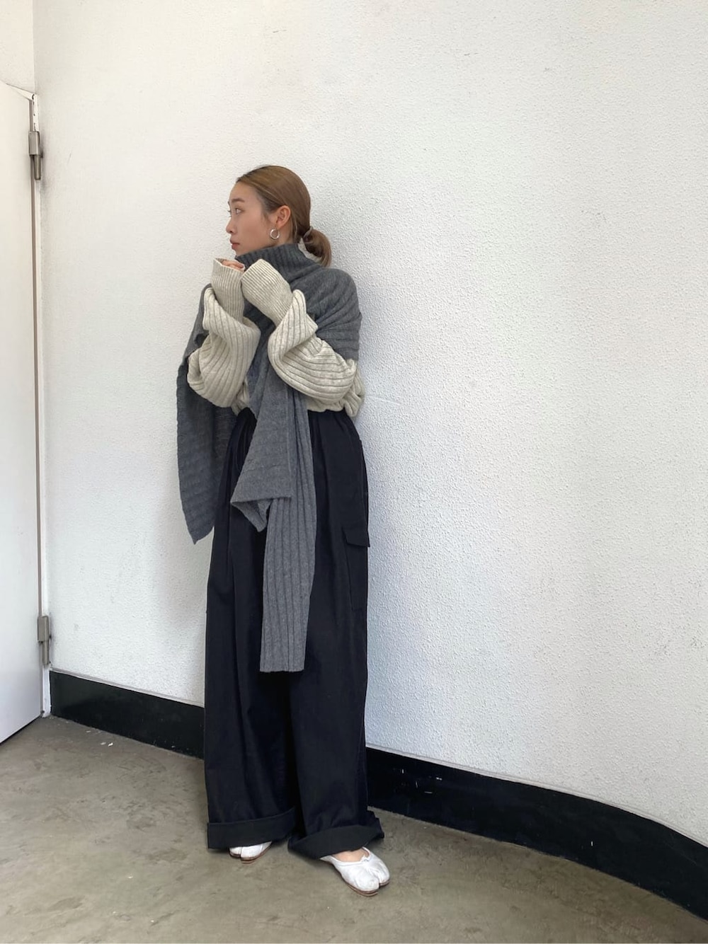 あえてワイドリブのニットで合わせておしゃれ見えする合わせに。マルチウェイニットは、そのまま着ても良し、マフラーのように巻いても良いので、持っておくと便利な1枚。