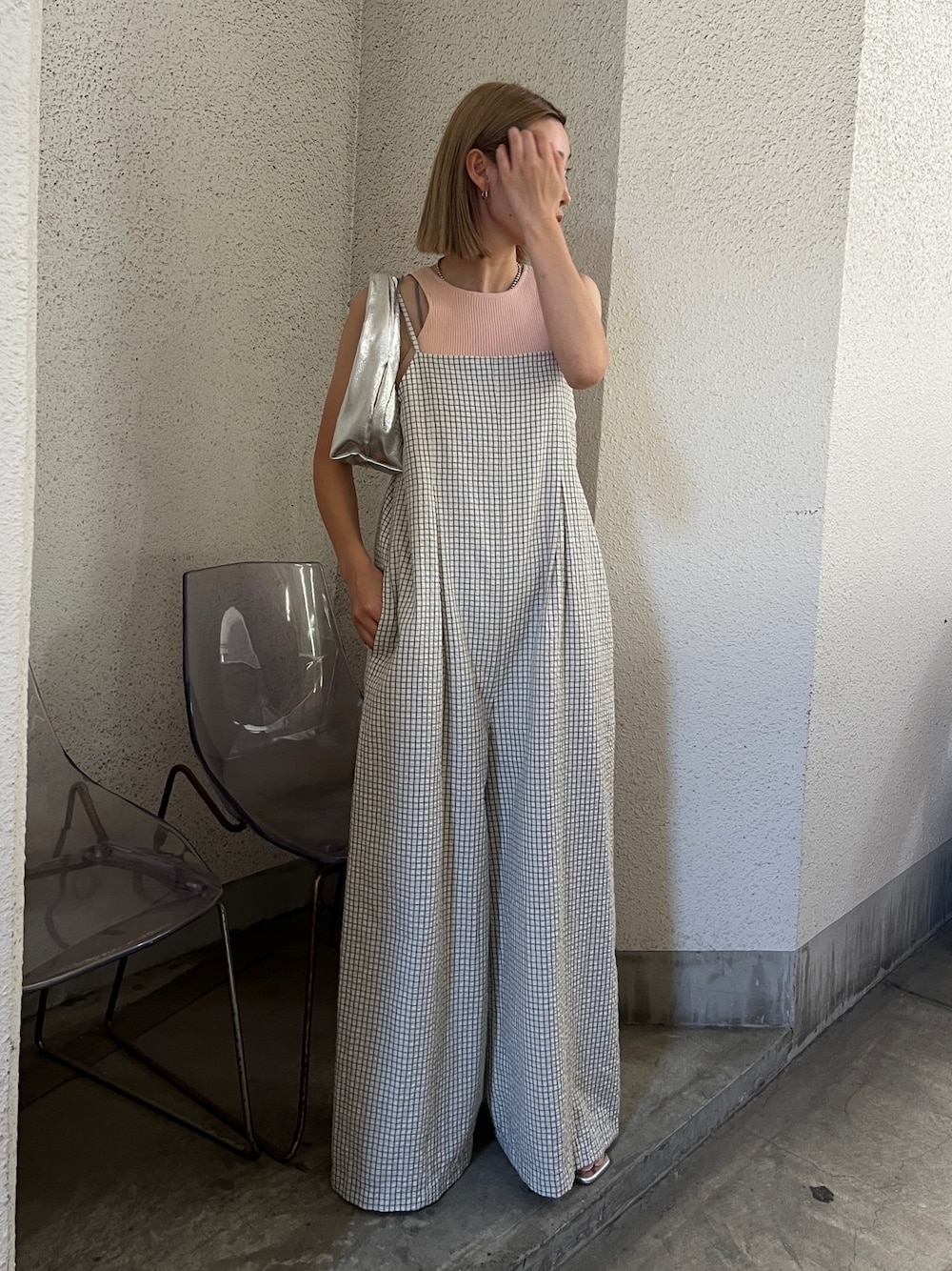 たっぷりボリュームシルエットが かわいいロンパース! パンツなので可愛らしくなりすぎず 大人なムードで着られます✨ サッカー素材のチェックが 他にはない生地感です! 肩紐で長さを調節できるので 身長に合わせて着丈を変えられます! ポケットもつけているので楽にきていただけますよ🆙