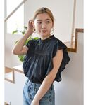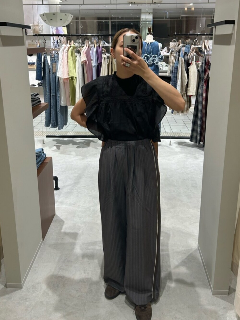 【トップス】 大きめのフリルが二の腕をカバーしてくれてノースリーブ苦手な方にもオススメです◎ インドメイドの繊細なレースが可愛いです♡ 【パンツ】 ウエスト総ゴムなのでとにかく楽ちんなのにしっかり見えする毎日履きたくなるパンツ! 裾にジップが付いていてスリットにもなります◎ 157cmSサイズでギリギリ擦らない丈感です。