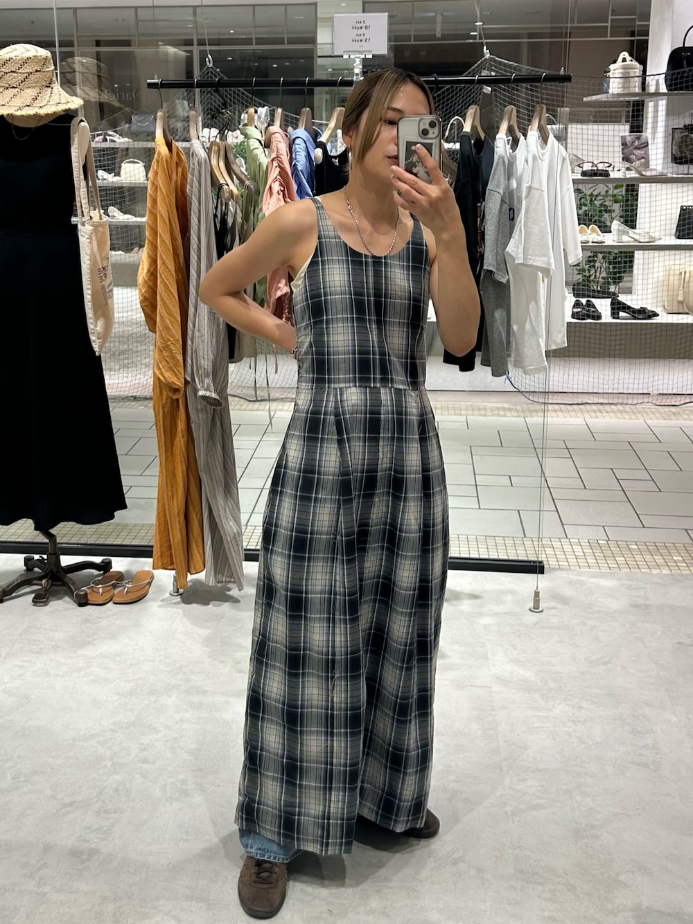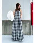 松岡奈瑠(Ungrid)のワンピース「コクーンチェックキャミワンピース」を使ったコーディネート