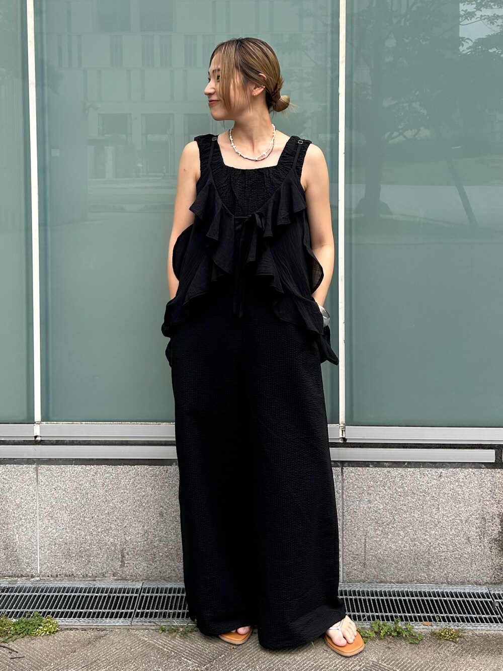松岡奈瑠(Ungrid)のつなぎ/オールインワン「スクエアネックギャザーデザインロンパース」を使ったコーディネート