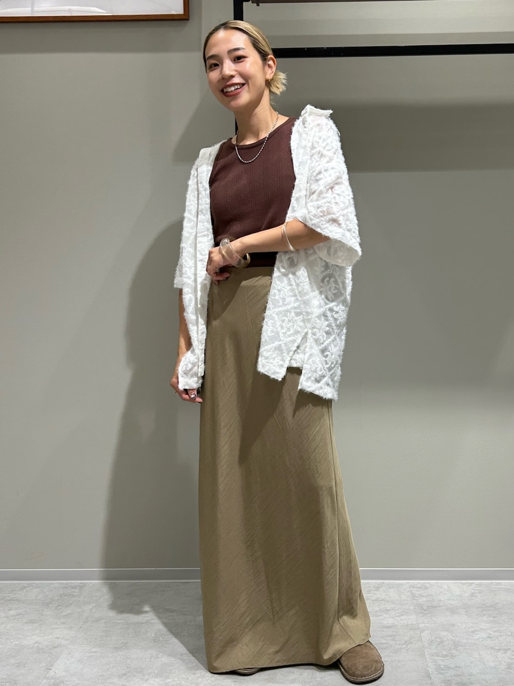 【シャツ】半袖で透け感もあり夏から着れますが起毛なので秋を取り入れて着て頂けます♡ 丈は長めでお尻すっぽり隠れる丈感ですがサイドにスリットも入っていてボトム選ばず着やすいです。 【トップス】 シンプルだけど針抜きのデザインが可愛い♡ 今っぽいカラー展開でどの色もシンプルにデニムと合わすだけでトレンド感あるトーンを演出してくれます。 【スカート】 程よくフィット感がありますが体型を拾いすぎないので着やすいです!後ろにスリットが入っているので動きやすさも◎