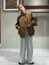 【アウター】 オーバーサイズなので中に厚手のニットやドルマンのスウェットもスッキリ着て頂けます。丈は157cmでおしりすっぽり隠れる丈感です。 【ボトム】 タックが入っているのでスウェットですがラインがスッキリ着て頂けます。ハイウエスト目で履いて4.5cmヒールで床から 1.2cm程度浮く丈感です。