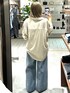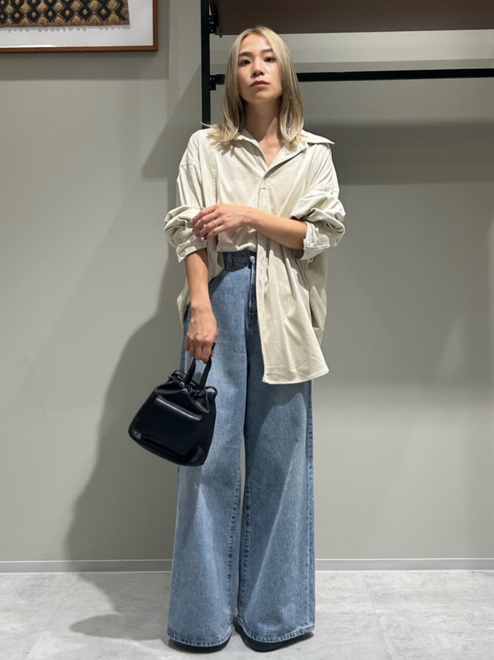 【トップス】 オーバーサイズなので羽織としても使いやすいです。157cmで太もも辺りまでくる丈感です。ボタンが2つぎゅっと詰まってるのがこなれ感あってオシャレ♡ 【デニム】 バギーですが丈長すぎず157cmでスニーカーでも履けました。スニーカーだと少し床に着きますが気にならない丈感です。足長効果抜群◎!!