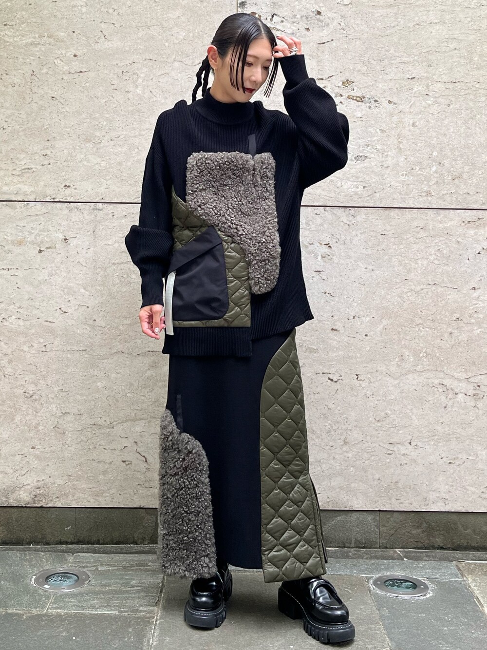 YUKI(UN3D.)のニット/セーター「FABRIC MIX KNIT TOP / ファブリックミックスニットトップ」を使ったコーディネート