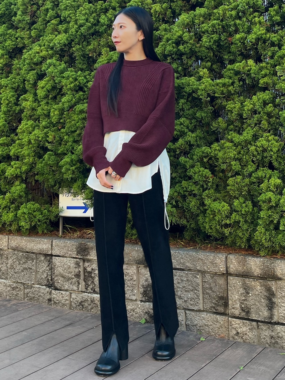 【ニット】 レイヤードなどにおすすめなショート丈のドルマンニット。 とにかくノンストレスな着心地で、とても暖かくご着用いただけます✨ 【パンツ】 思わず毎日履きたくなってしまうほど履きやすいニットパンツ。 楽ちんなのにしっかりモードに見えるので、部屋着感もゼロ✨ 程よいストレートシルエットと裾スリットでどなたでも履きやすい形になってます😊