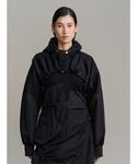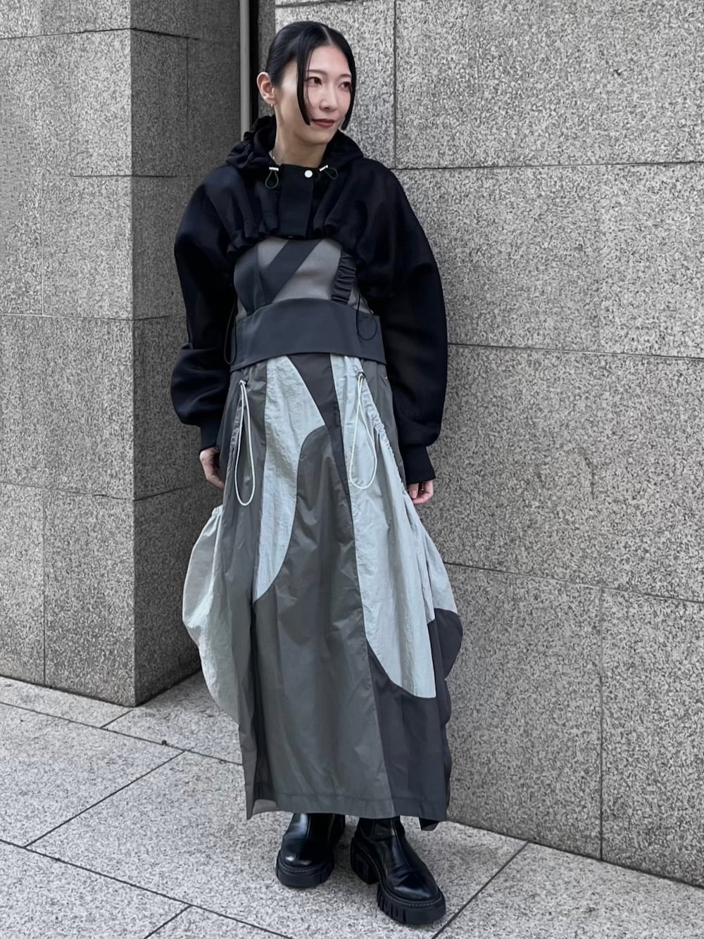 【ブルゾン】 ほどよい透け感とハリと軽やかさを併せ持つ段ボールニット素材のショート丈のマウンテンパーカー。 UN3D.らしい前後差があって合わせやすくスタイルアップして見えるシルエットになっております。 春夏の羽織に重宝する1着です! 【ジャンバースカート】 【地層】をイメージした4種類の生地を曲線的に切り替えたデザインのジャンパースカート。 とても軽くしなやかな素材なので着心地もストレスフリーです。 肩紐はボタンで調節可能◎