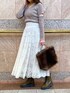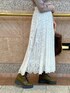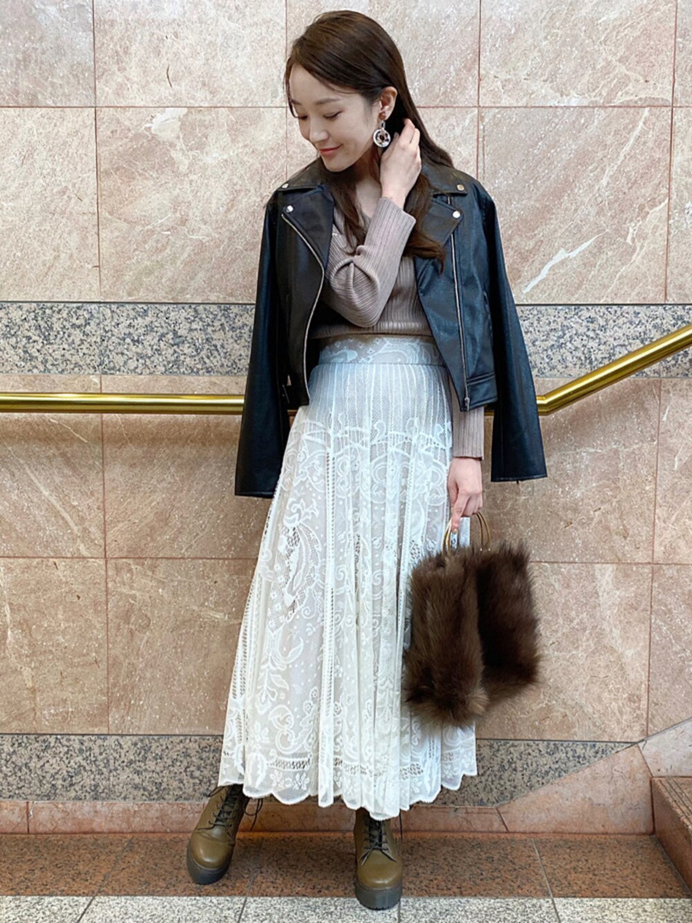 オリジナルの総レース柄が目を引く、特別感のある主役スカート❤︎アイボリーは裏地がベージュの配色になっていて、お洒落なレース柄が際立ちます♬ しっとりした落ち感のあるフレアシルエットが魅力的なので、トップスや羽織りはコンパクトにまとめると◎ ライダースジャケット・アームスリットのニット・ワークブーツ合わせで、さりげなくロックなテイストを取り入れて、エッジの効いたスカートstylingに仕上げました☺︎