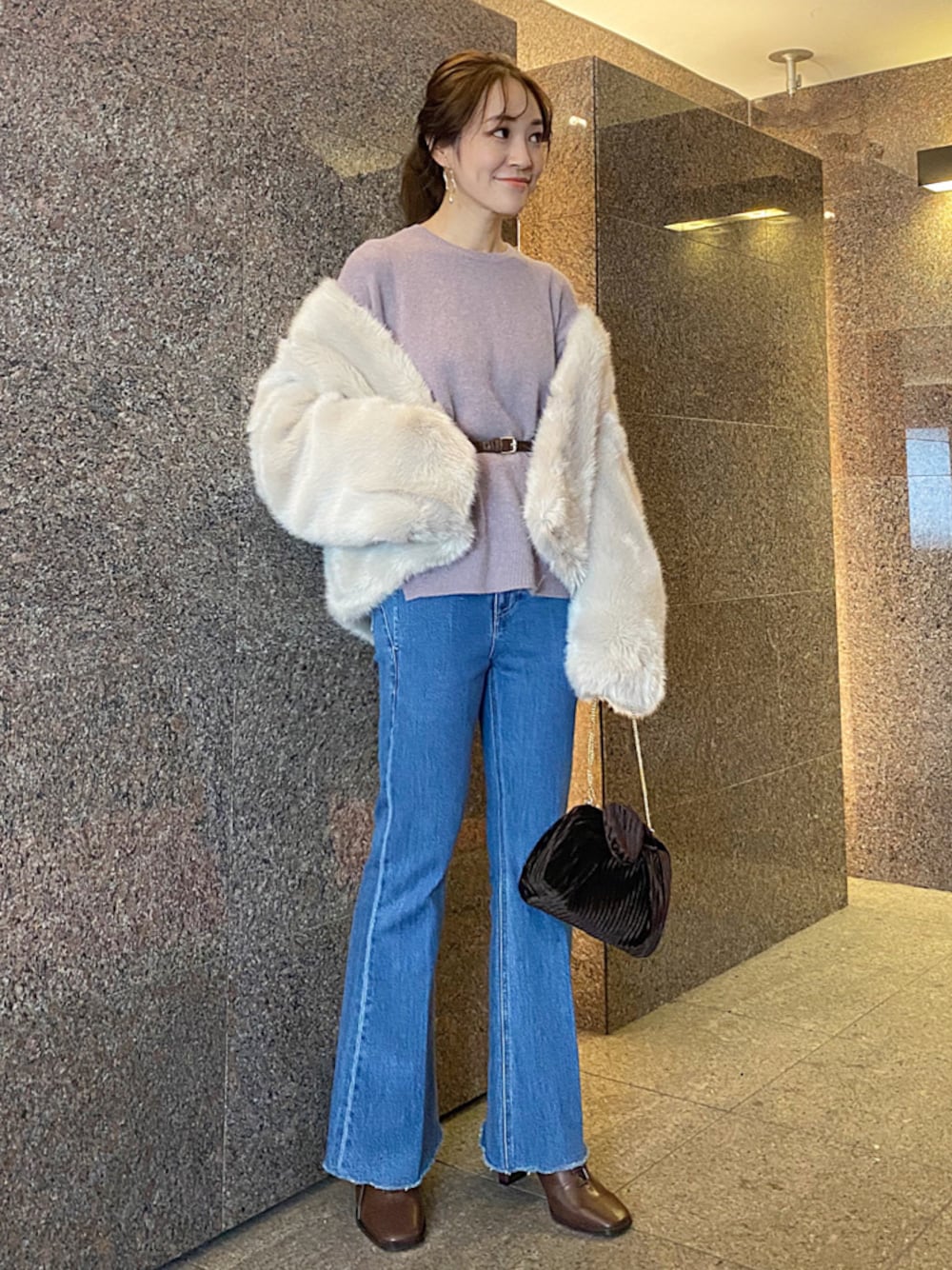 コロンとしたコクーンシルエットが愛らしいエコファーコートは、デニムとも好相性❤︎ 風合いの良いラクーン素材のニュアンスカラーニット、美脚に見せてくれる大人デニム+ファーアウターで、 いつものデニムコーデも格上げされた印象に◎ 長め丈のニットはサイドスリット入りで、そのままユルっと着ても可愛いですが、ウエストマークのベルトをすればキレイめな印象で着こなせて、大人女性やキレイめstylingがお好きな方にオススメです♬