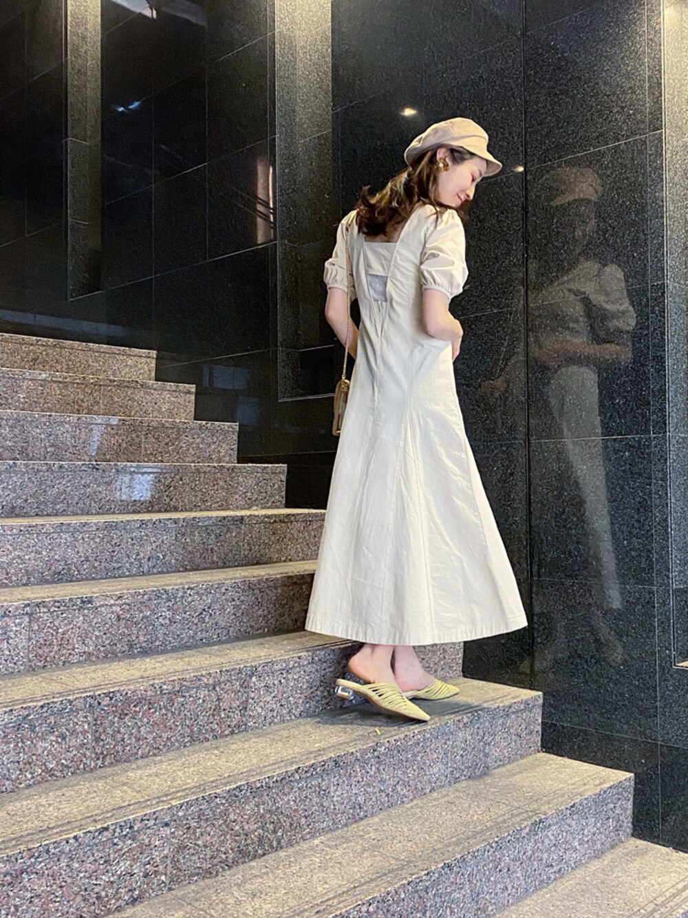 白デニムが爽やかで、暖かい季節にピッタリなワンピース❤︎ コットンデニムに加工をかけてあり、柔らかくて軽い生地で着心地の良さ◎ バックシャンデザインで開きがあるので、レースキャミ等のインナー着用がおすすめです☑︎ パフスリーブ・カシュクールネック・フィット&フレア...とシルエットにメリハリがあって、スタイルUPが叶う一枚☺︎ ワンピースには共布ベルトが付いていますが、 キャスケット・クリアbag・イエローサンダルと デザイン小物をプラスしたので、敢えてベルトは付けず、すっきり大人カジュアルにまとめました♪