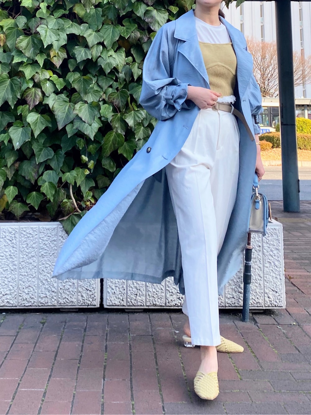 大人女性ライン[ To / ]の新作トレンチコートを主役にした、キレイめカジュアルコーデを組みました♡ ニュアンスあるくすみブルーがこなれ感たっぷりのトレンチコートに、イエロー・ブルーの小物を合わせて遊び心あるカラーコーディネートに♪♪ 【コート】 トレンドのシアー素材で仕立てたロング丈のトレンチコートは一枚で着映えするitem⤴︎ 落ち感のある美シルエット・なびき方がエレガントなエアリーな素材・バックプリーツ等[ To / ]らしい拘りが詰まっています‼︎ 袖口ベルトをしめてブラウジングするとボリュームスリーブにアレンジできて、手首をスッキリ見せられます◎ 【トップス】 ノースリーブのカットソーとニットビスチェがSETになったお得なitem♡ コンパクトシルエットと華奢なストラップデザインで女性らしさUPできて、後ろ姿まで抜かりなく♪♪ 【パンツ】 白デニムのような見え感ですが、リネン混のナチュラルな生地になっていてシーズンムードも◎ (白でも透けにくい素材になっています) 少し緩めのシルエットが今年らしいテーパードパンツです♡ ハイウエストデザイン+フリンジや付属ベルトで目線が上にいくので脚長効果大!