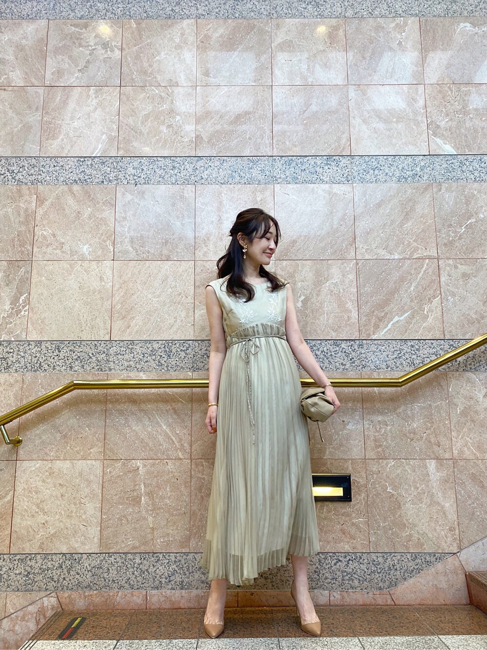 ミントグリーンが爽やかで、お呼ばれにもピッタリなワンピースstyling♡ ワンピースはフィット&フレアシルエットで、肩口までのスリーブなので着痩せ効果も◎ エアリーで少し光沢のある素材とスカートの細やかなプリーツ遣いがエレガントです♪♪ 胸元のMERCURYDUOオリジナル刺繍も拘りPOINT☑︎ 私はベージュのパンプス・クラッチbag・ゴールドアクセサリーでお呼ばれ仕様にしましたが、 デイリーカジュアルには羽織りをGジャン・ライダース・ロングカーディガン、足元をサンダル等で合わせても◎ 小物や羽織りの合わせ次第で、デイリーから特別な場面まで♪ これからのstyling組みが楽しくなる一枚です‼︎