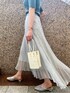 グリーン×シルバーが涼しげなキレイめスカートstyling♡ スカートとサンダルのメタリックな輝きが太陽の下で映えて魅力的! くすみグリーンの5分袖ニットとコンパクトなスクエア型bagでお上品さをプラスしました☺︎ 春夏のお出かけ・デートコーデとしても◎ 細かなプリーツ・シアーな生地で仕立てたスカートは、ふとした動きや風になびいてエレガントなムードを演出♪♪ 裏地〜裾の透け感やイレヘムデザインのコントラストもPOINT☑︎ 今回はベーシックな形のニット合わせでキレイめにしましたが、夏はTシャツ合わせでカジュアルダウンstyleもオススメです♡