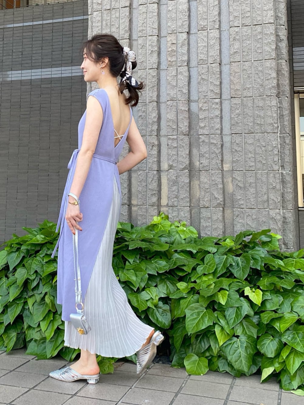 \ デートにも女子会にも◎着回し自在ワンピース / くすみブルーのリブニットワンピースと、ライトグレーのシフォンプリーツスカートのSET item♡ マットなニットワンピースから繊細なシアー素材のプリーツスカートが覗く、素材の質感違いレイヤードがPOINT‼︎ 涼しげな寒色グラデーションが素敵なので、シルバーのbagとサンダルで爽やかに仕上げました☺︎ カラーやディティールがエレガントなので、 私はスカーフのヘアアレンジを足してトレンドミックスに♪ デザインインナー合わせのバックシャンstyleは、お洒落に見せたい女子会にもオススメです⤴︎ ニットワンピースは前後2wayなので、フロント開きにしてインナー合わせでデコルテすっきり+女性らしいダウンヘアーならデートにもピッタリ♡ ニットワンピースの右脇には1箇所リボン通しがあって、そちらに通すとカシュクールに重ねて着用できるデザインです。 リボン結びはフロントでもバックでもお好みでアレンジできて、 そのままサイドリボンにしてラフに垂らす、リボンをくるっと1〜2周させてウエストマークもOK! 〈単品着回し〉 ニットワンピース→ロング丈のニットジレのようにも着こなせるので、デザインインナー+ワイドパンツ・白デニム・柄パンツやシャラっとしたスカートとのレイヤードも可愛いです♡ プリーツスカート→裏地も入っていて、濃い色の下着でなければ透けも気にせず単品で着用できます。 コンパクトなサマーニットやTシャツを合わせた MERCURYDUOらしい大人な甘カジュアルstylingも◎
