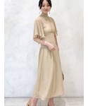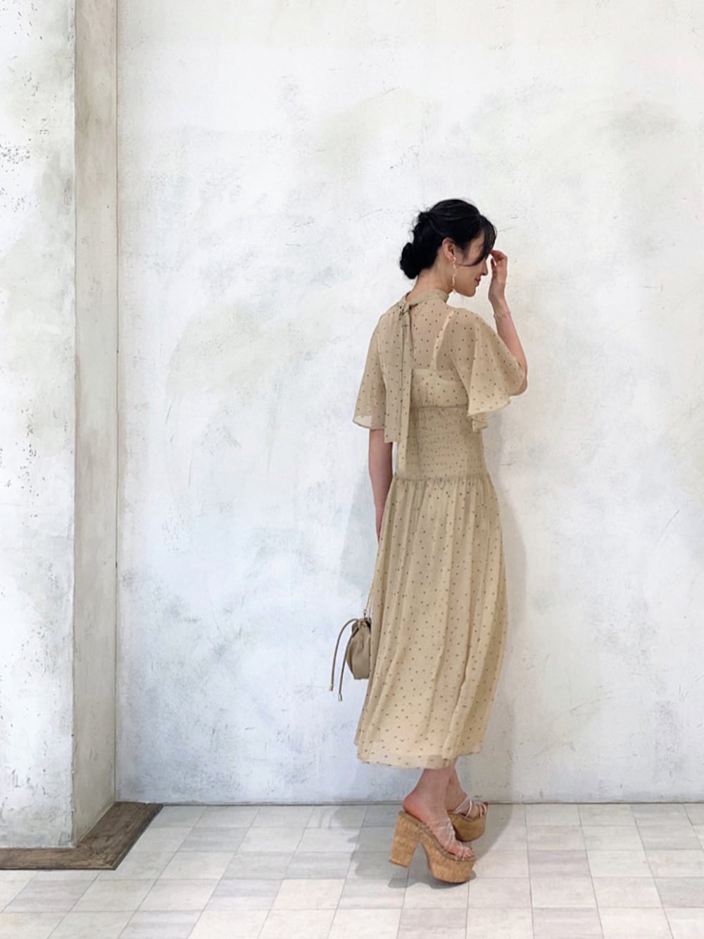 \ ドット柄で甘さをプラス♡お上品ワンピース / シフォン生地がひらっと風になびいて、エレガントな表情のワンピース♡ ドット柄とボウタイデザインがちょっぴりレトロで大人可愛い♪ バックスタイルのボウタイはリボン結びもできますが、ラフに垂らすと抜け感が出てお洒落見えします⤴︎ ギュッと胸下から腰にかけてシェイプされたデザインが新鮮さもあり、スタイルUP効果◎ 5分袖のフレアスリーブで二の腕カバー+お袖の長さがあってもシアー素材で重たくならずに一枚で涼しく着用できます‼︎ (インナーキャミソール付なので、安心して透け感を楽しめます) きちんと感があるのに、着心地が軽くてストレスがないのも夏に嬉しいPOINT⤴︎ 私はウエッジソールサンダルと華奢bagで、夏のデートstyle仕様に♪ パンプスや軽いカーディガン・ジャケット等ベーシックな合わせにすれば、オフィスや顔合わせ等のきちんと感が必要なシーンにもオススメです☺︎