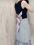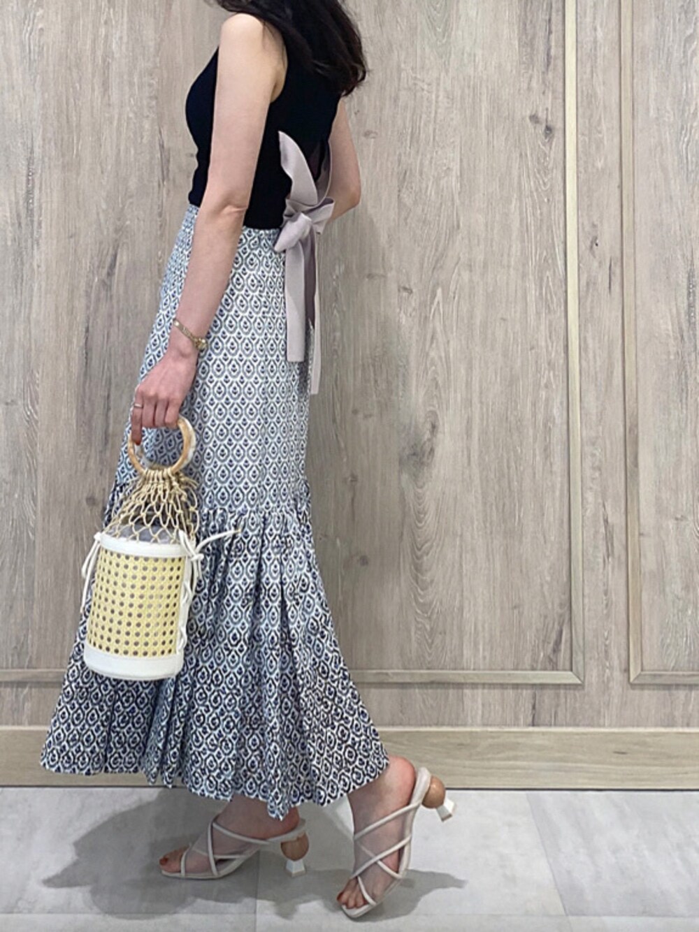 \ エスニックニュアンスが新鮮なスカートコーデ☺︎ / 夏のお出かけデートや女子会にオススメ♪ 拘りたっぷりのオリジナル柄スカートとバックシャンのノースリーブニットで涼しげ華やかstyling♡ フィット&裾フレアの変形シルエットがお洒落です♪ トップス・スカートでモノトーンに近い配色+小物はベージュ系でまとめて、しっとり大人っぽく仕上げました! 【トップス】 フィット感のある細リブのノースリーブニット。 フロントはベーシックですが、 カシュクール・リボンデザインでバックスタイルがPOINTに◎ リボンは長めなので、結び方のアレンジで雰囲気を変えられます⤴︎ リボンデザインからチラッと肌が覗く仕様になっていて、 デザインインナーを合わせるのもオススメです! 【スカート】 柔らかな風合いと少しあせたような色味が魅力的なインド綿シリーズ。 オリジナルのエスニックなプリントとカットワーク刺繍のコンビになった加工が他にはないitem♡(同シリーズのブラウスver.もお作りございますので、そちらとSETでの着こなしも◎) ウエストからなだらかに体に沿い、裾の切替からタックフレアになっているので、裾にしっとりした重厚感が出て特別感を演出してくれます♪ 【シューズ】 シアーなメッシュ素材がクロスになったデザインの 華奢サンダル。積み木デザインとメタルプレートのヒールで後ろ姿に個性をプラス♡(意外と安定感があって歩きやすいヒールです!) 主張がありつつ肌馴染み良いカラーと洗練シルエットで、お洋服のテイスト問わず合わせやすいitemです♪