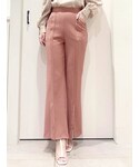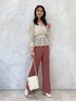 \ 大人フェミニンなカラーパンツstyling♡ / くすみピンクのパンツをアクセントに、アイボリーベース×カーキのドット配色がPOINTのブラウスを合わせて、ほんのり秋先取りコーデに♪ bag・ブーツはホワイトで統一して、スッキリ洗練された印象にまとめました! 普段スカートやワンピースが多い方にもチャレンジしやすい、可愛げパンツstyling♡イメチェンや気分転換にいかがでしょうか?☺︎ 【ブラウス】 シアーなシフォンに細かなドット柄がプリントされたブラウス。 Vネック・胸下のコルセット調シャーリングゴム・袖にたっぷり入ったギャザーで、シルエットにコントラストがあり華やかさをプラス♡ キャミソール型のインナーが引っ付いているので、デコルテ〜お袖の部分が透けて、抜け感のある印象に♪ 胸下から広がるデザインなので、ボトムはスッキリしたパンツやタイトスカート合わせが相性◎ 【パンツ】 フロントにピンタックが入った美シルエットのフレアパンツ。 ピンタックの裾部分にスリットが入っているので、歩いた時にチラッと足首が見え、デザインシューズも映える足元に♪ フレアが始まる位置が高めで脚長効果も◎ キチンと感ある生地・シルエットなので、ベーシックなトップス合わせで通勤にも◎な、ON/OFF対応できるパンツです! 〈サイズ〉S・Mサイズでウエスト・ヒップ3㎝差、丈は約4㎝差です。ウエストバック部分にゴムが入っているので、162㎝細身の骨格ストレート着用で、Sサイズも履けましたが、丈はMサイズの方が合いました。(ゴムがある程度、ウエストにもフィットしてくれます♡)