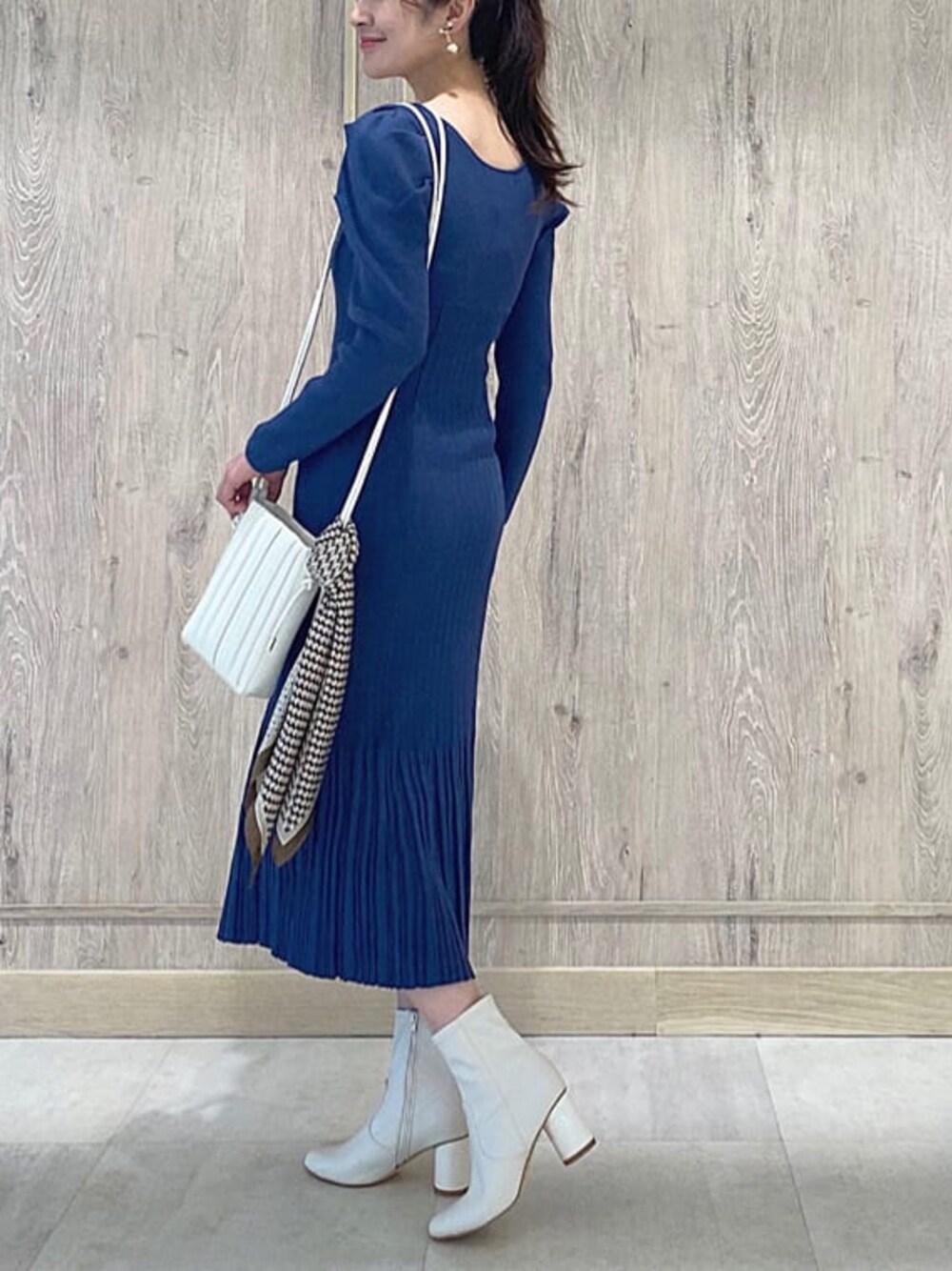 \ サクッとスタイルUPが叶うニットワンピース♡ / 胸下・裾で切替されたテクニカルな細リブ編み、身体に沿ったマーメイドシルエット、デコルテがきれいに見えるネックライン、パワショルデザイン...ボディーラインを美しく見せる事に拘ったニットワンピース! 女性らしさとトレンドディティールが詰まった一枚なので、 お洒落に見せたい女子会やデートにも◎ キレイめシルエットなのに被るだけで着れるプルオーバータイプで、お着替えが数秒で済んじゃうのも嬉しいPOINT⤴︎ 忙しい朝にもサクッと一枚で決まるので、日常遣いにもオススメです♪ カラー展開が4色と豊富ですが、 私は秋を感じさせる深みあるブルーに惹かれました☺︎ 鮮やかな紫みのあるロイヤルブルーを、少しだけくすませたようなニュアンスカラーが素敵♡ 格好よくてインパクトもあるカラーなので、bag・ブーツはホワイトchoiceでクリアに、まとめ髪でスッキリとコーディネートしました☑︎ 揺れるモチーフイヤリングとスカーフで女性らしさもプラス♪ 芯のある大人女性を演出できるstylingです!