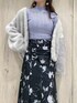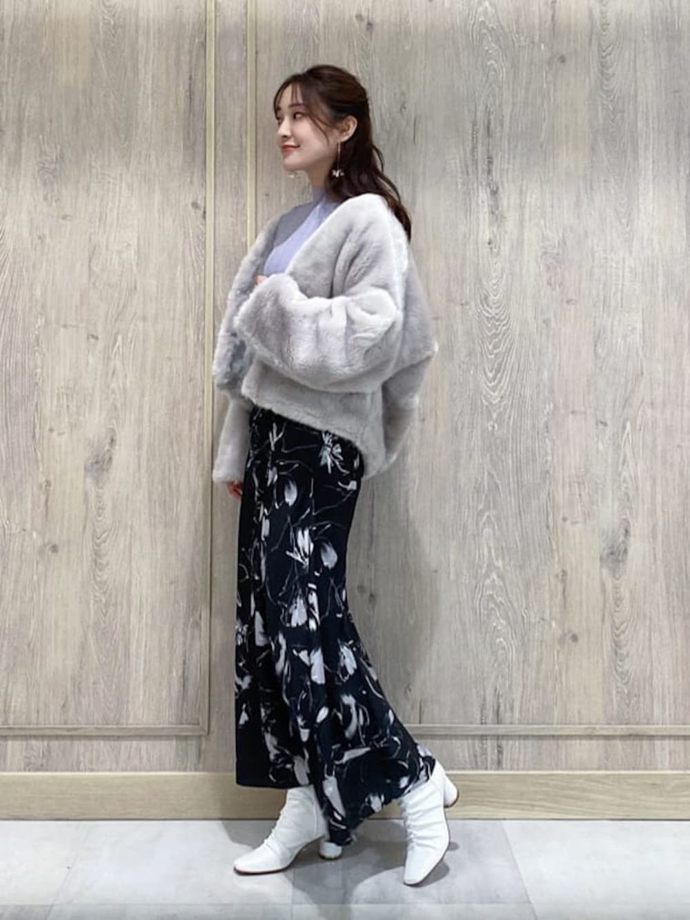 \ 大人フェミニン派のショートアウターstyling♡ / ライトグレーのファーコート×ラベンダーのタートルニット×白ブーツ...ウインターパステルを、キリッとブラックのロングスカートで引き締めました♡ フェミニン派さんには勿論、「ウインターパステルは好きだけど、着るには勇気がいる...」という大人女性にも◎ 愛らしさの中にも大人の芯の強さを感じさせるコーデを身にまとって、冬のお出かけはいかがでしょうか?☺︎ 9枚目〜のようにコートを脱いでも可愛いので、今からコート無しで、すぐにデビューできるstylingです♡ 【コート】 去年大好評だったエコファーコートが、今年も登場! 毛を逆毛にして入れている事でボリュームが出て、お値段以上の存在感♪ 繊細な毛足で肌触りも最高です⤴︎ ショート丈でバランスを取りやすく、 コクーンシルエットを活かして抜け襟っぽく着こなすと、丸みのあるラインになって後ろ姿も可愛い♡ 今年は新たに袖にタックを入れて、ぽってりした愛らしいシルエットに仕上がっています☑︎ 【トップス】 デイリー遣いしやすく、MERCURYDUOらしいカラー展開が魅力的なタートルニット。 ベーシックitemですが、リブの編み方やモチッとした肌触りの良い伸縮性のある生地でスッキリ見せてくれる拘りの一枚! インナーとしても優秀で、4つ前のstylingでワンピースのインナーとして着用しています☑︎ 【スカート】 MERCURYDUOオリジナルのアートプリントが特徴のロングスカート♡ ほんのり艶っぽい生地や、身体に自然に沿う大人っぽいシルエットが特別感⤴︎ ウエスト〜腰回りのギャザーテクニックがお洒落な上に、お腹や腰回りのラインをカモフラージュしてくれて体型カバー効果もあるので、お食事シーンにも◎