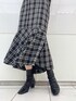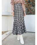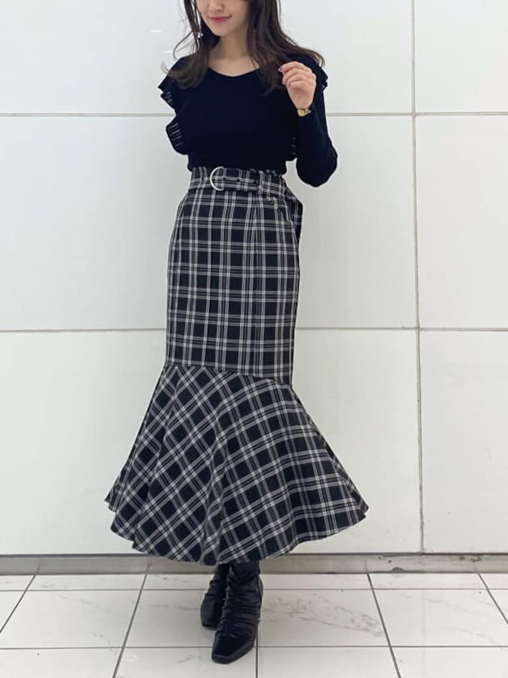 \ 大人が楽しむ、ほんのり甘めなブラックコーデ♡ / トレンドのマーメイドスカートを主役に、私には珍しいAllブラックコーデを組みました☺︎ ラッフルスリーブのニット・チェック柄スカートで甘さを取り入れて、フェミニン派さんもチャレンジしやすいブラックコーデに♪ 足元はフロントギャザーのショートブーツを合わせて、キレイめな印象に整えました☑︎ 大人の可愛らしさを演出できるstylingで、イメチェン・気分転換を♪ デイリーには勿論、デートや女子会などお出かけシーンにもオススメです⤴︎ 【トップス】 夏に人気No.1だったシリーズが長袖になって登場! 大振りすぎずに大人可愛いラッフルスリーブと、 上半身を華奢に見せてくれるコンパクトフォルムがPOINT☑︎ 袖に針抜きを入れたランダムリブ・太めの裾リブと編みがテクニカルで、ボトムアウトで着こなしても スッキリ見えします♡ スクエアネックとVネックの両方で着用できる前後2WAYタイプ。 【スカート】 ストレッチが効いたしなやかな生地で、動きまでエレガントに見せてくれるマーメイドスカート♡ ハイウエスト・腰回りはフィットでスッキリ、裾のロー切替でシルエットにコントラストが効いています☑︎ 更にウエストマークできるベルト付きで、スタイルアップ効果◎ 裾のサイドが少し短くてバックが長い、変形イレヘムカットになっているのがお洒落で、揺れ感も表情豊かに♪ 無地2カラー・チェック柄2カラー展開とバリエーション豊富なのも嬉しいPOINT☑︎