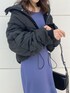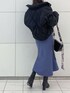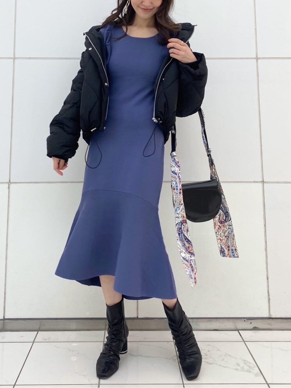 \ 冬の女子会にも◎きれいめ×カジュアルMIXコーデ♡ / パープルみの深いブルー×ブラックで、キリッと華やかなカラーコーディネート♪ 主役のワンピースが女性らしいシルエットなので、強めな配色でもフェミニンさはキープ♡ きれいめワンピースとカジュアルアウターのテイストミックスコーデでトレンド感◎ ワンピースのカラーを拾ったスカーフ付きのbagをアクセントにしました。 大人女性の芯の強さ、お洒落を楽しむ遊び心の詰まったstylingです! 日常で気分を上げたい時やイメチェン、女子会にも◎ 【アウター】 フードが取り外し可能になっている2WAYデザイン。 私はスッキリきれいめに着たくて今回はフード無しで着用しました♪ 大きめのダイヤキルトがPOINTになった中綿ショートコート。 パウダリーな生地で中綿なのに軽いのが嬉しい♡ 袖口にはリブ切替も付いているので、防寒性も◎ 裾のドロストを絞ってコロンとしたコクーンシルエットで着たり、絞らずにAラインで着たり...とアレンジも楽しめます♪ 【ワンピース】 パワショル・マーメイドシルエットでトレンド感たっぷりなニットワンピース♡ 取り外し可能な衿が付いていますが、今回は大人っぽく着こなしたくて付属品無しで着用しました♪ 胸下や裾に切替がありボディーラインに程よく沿ってくれるのでスタイルUP効果も◎ ニットワンピースには珍しくS/Mサイズ展開があり、 丈が5㎝差なのでお好みで選べるのも嬉しいPOINT⤴︎他のワンピースと比べてMサイズでもスッキリめの丈なので低身長さんにもオススメです!(162㎝・Mサイズ着用)