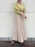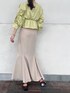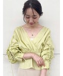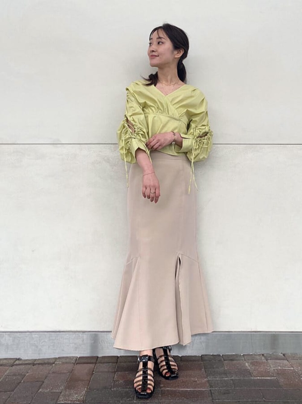 \差し色ライム×きれいめシルエットの、大人トレンドコーデ♡/ 鮮やかなライムのブラウスをPOINTに、全体はきれいめなシルエットにまとめた大人のトレンドカラーコーデ。 薄ベージュのマーメイドスカートでエレガントに。ブラックのクリアサンダルとグリーンのネックレスでエッジを効かせて、大人なスパイスをプラスしました♡ お出かけや女子会などで「お洒落に決めていきたい!」という時にオススメなコーデです☺︎ 【トップス】 デザインスリーブがトレンド感たっぷりなブラウス。 ギャザーをぎゅっと寄せるとボリュームのある立体的なスリーブになるのがPOINT☑︎ カシュクール・ペプラム切替・短丈...とシルエットにメリハリのある一枚です! 後ろに抜いて着ると胸元すっきりで後ろはギャザーがたぷっと溜まる、360度抜かりない着映えitem♪ 【スカート】着心地抜群で動きやすいストレッチ素材のマーメイドスカート。ハイウエスト・腰回りまでフィット・ロー切替でシルエットにコントラストがあり、スタイルUP効果◎ 贅沢なフレア使いで歩くたび揺れ動く裾が魅力的♡ フロントの片側に入った、さりげないスリットもPOINT☑︎ 162㎝/骨格ストレートの私はMサイズを着用しました。ピタッとキレイめに着たければSサイズも◯ 横幅が約2㎝差で丈が5㎝差なので着用感や丈のお好みでサイズを選ぶのがオススメです!(5つ前のstylingで同スカートギンガム柄ver.のSサイズを着用しているので、丈感の違いを参考にしてみて下さい☑︎)