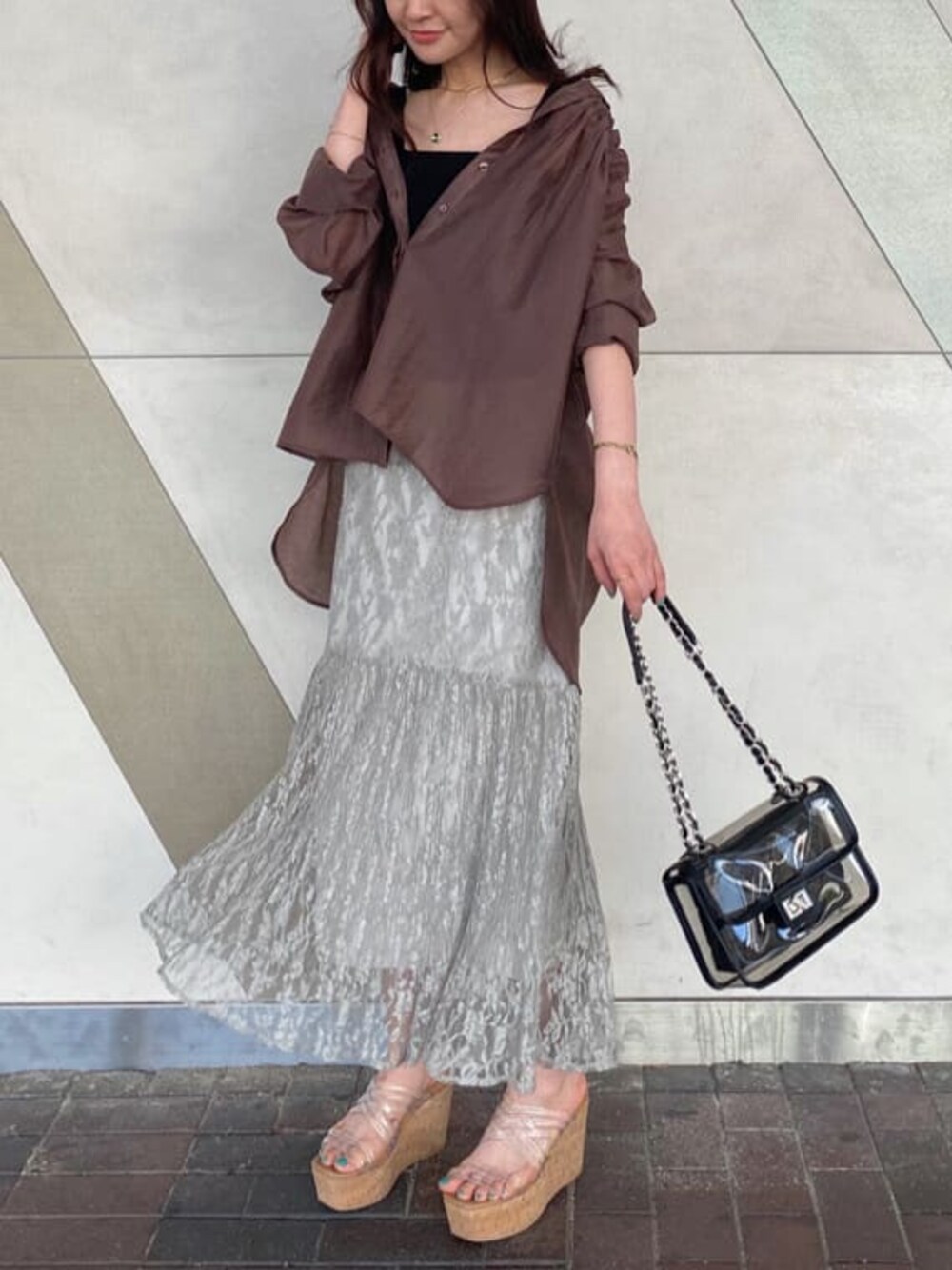 \イエベ秋さんにオススメ♪ きれいめカジュアルstyling/ くすみのダークカラーが得意なイエベ秋さん♡ くすみミントのレーススカートとブラウンのシアーシャツで春夏らしい軽さも取り入れつつ、オシャレで似合う・魅力度UPのカラーコーデに。 シャツのインナーキャミやbagはブラックでキリッと締めて、足元はクリアサンダルで涼し気にまとめました☑︎ 落ち着いた配色なのでイエベ秋さん以外に、パステルカラーを大人っぽく着こなしたい方にもオススメなコーデです! 【シャツ】 胸元と背中にシャーリングを施したシアーシャツ。 透明感とトロンとした質感が美しく、フェミニンなスカート・ワンピースstylingにも合わせやすいように拘ったitemです♪ 柔らかく軽い生地で、夏まで羽織としても◎ 手洗いOKですぐ乾くので、これからの季節に重宝する一枚☑︎ シャツとして着るならインナーベアやキャミを合わせてベルトでウエストマークするstylingもオススメです♡ 【スカート】 繊細なレースとプリーツ加工がPOINTのスカート。 ストンと落ち感あるシルエットに見えて、さりげなくロー切替のマーメイドラインになっているのが拘り♪ 裾を消しプリーツにすることでフワッと広がる軽やかさがあり、歩き姿も絵になる一枚です☺︎ 【サンダル】 MERCURYDUO夏の定番サンダル。 PVC素材のチューブをクロスしたアッパーがアクセントに♪ ウエッジソールがとても軽く仕上がっていて傾斜もなだらかなので、長時間履いていても疲れ知らず♡ 足のサイズ23.5㎝/足の甲・横幅標準の私が36サイズでぴったりの着用感でした!