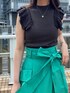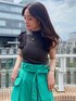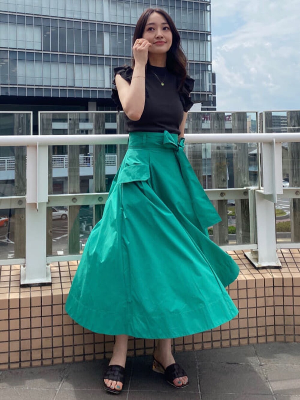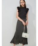 \ニットセットアップ着回し②/ 夏のお出かけ〜デイリー遣いまで大活躍!シアーで軽いニット素材が夏らしいニットセットアップ。 今回はトップス単品を着回しました♪ (前回はSETで、次回はスカート単品での着回しもUPしますので、そちらも是非ご覧ください♡) チャコールグレー×鮮やかなグリーンのフレアスカートで、夏空に映えるカラーコーディネートに。 カラースカートにホワイトではなく、敢えて落ち着いたニュアンスカラーのトップスを合わせる事で、大人っぽくオシャレな印象に仕上がります♡ ネックレスのカラーをスカートとリンクさせたのもPOINT⤴︎ 【トップス】ラッフルデザインがPOINTになったコンパクトなサマーニット。 裾のリブ切替でインしてもアウトしても合わせられるバランスになっています。 【スカート】 腰回りスッキリ、贅沢に広がるフレアシルエットが美人オーラ溢れるクラシカルなスカート♡ ハリのある落ち感素材なので、フレアが着太りして見えて苦手とされる骨格ストレートさんにもオススメできるスカートです! アウトポケット付・裾のイレヘムデザイン...と細部まで拘りの光る一枚。 ウエストマークできる共布ベルト付なのも嬉しいPOINT☑︎ 162㎝/ Sサイズ着用で、足首がしっかり見える丈感です!
