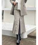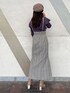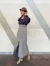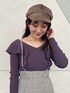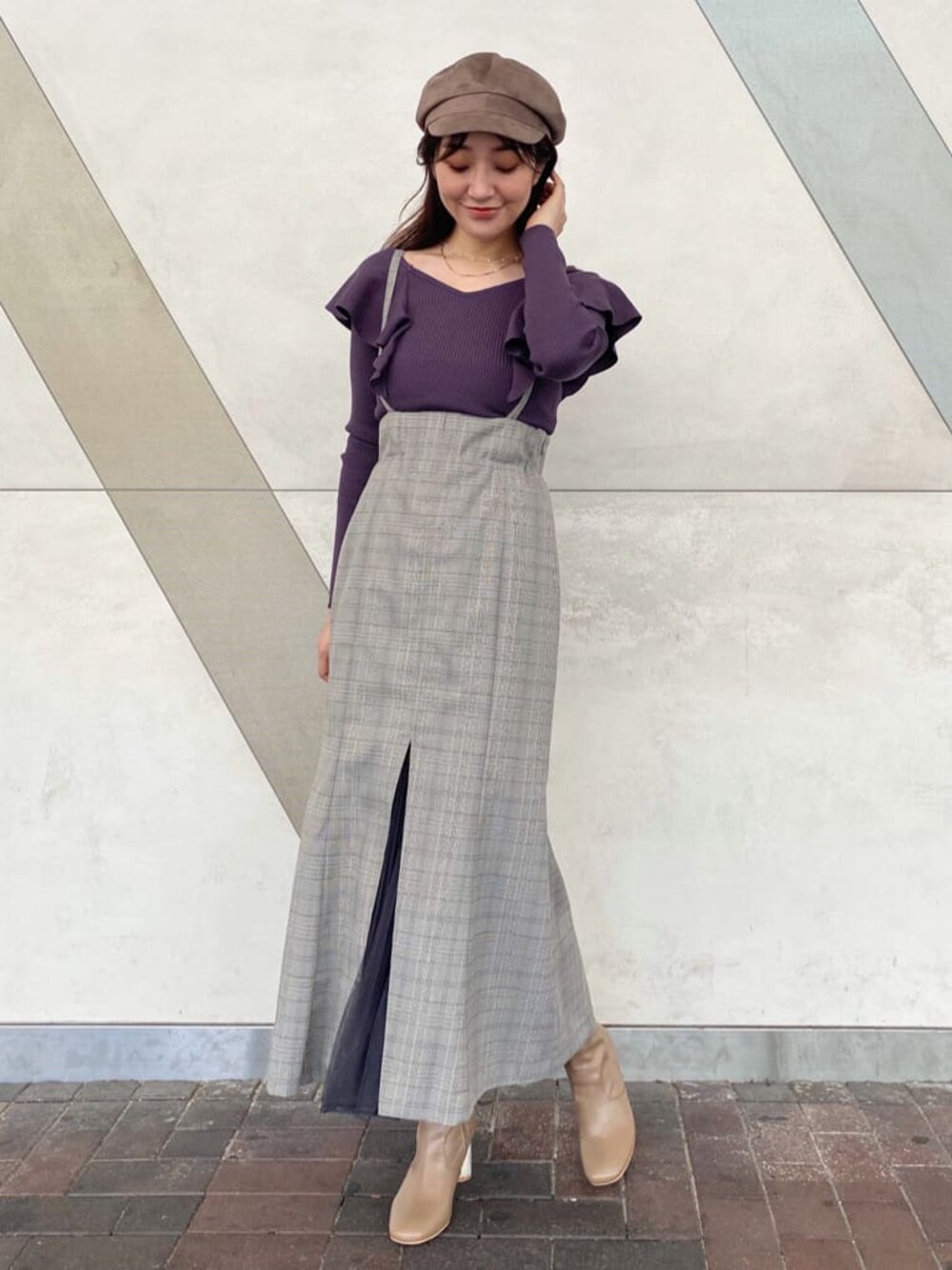 \大人女性向け♪ トレンド感ある秋カジュアルコーデ♡/ サスペンダー付きのチェック柄スカート×こっくりパープルカラーのニットで、秋を楽しむコーデ◎ モカベージュ系のキャスケットとショートブーツで、 まろやかで大人っぽさのあるカジュアルstylingに仕上げました! シーズンムードもトレンド感もあるコーデは秋のお出かけを楽しくしてくれそう♡ 涼しくなったらライダースやロングコートを合わせても素敵です☺︎ 【トップス】 すっきりとボディにフィットするリブ編みをベースに、ラッフルをあしらったコンパクトニット。 上半身をスッキリ見せてくれつつ、女性らしく華やかな印象に♪ 伸縮性のあるモチっとした生地で着心地抜群です! スクエアネックとVネックの前後2WAYで着用できるのも嬉しいポイント☑︎ 【スカート】チュールをフロントにして華やかなスタイリングと、逆にしてバックスタイルにアクセントを効かせた大人っぽい着こなしを楽しめるスカート。 ハイウエスト・なだらかなマーメイドラインでスタイルアップ効果◎ 華奢なショルダー紐を付けて、トレンドライクなサスペンダースカートとしても着用できます! カラーによって生地や織り柄を変えているのもポイント! 162㎝/Mサイズ着用で、足首が見える丈感です☑︎