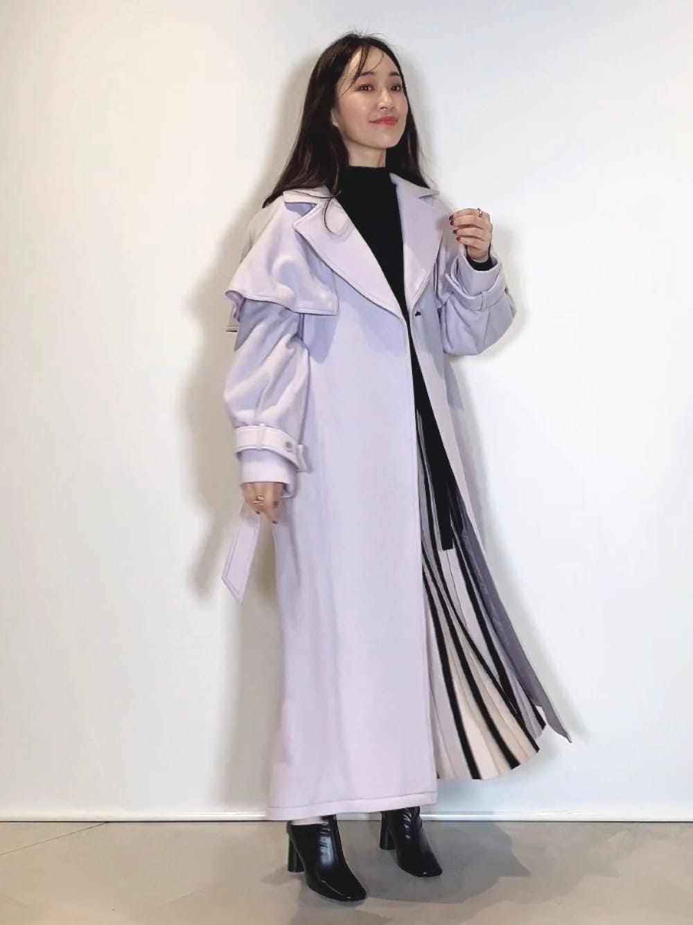 ✍️リール詳細 Instagram(@mercuryduo_manami)で \MERCURYDUO outer7selection/ リール更新しています🧥♡ 【ウール2WAYケープ付きロングコート】 ウール88%入りで驚くほど軽く、暖かなロングコート🦙 取り外し可能なケープ付きで、トレンドもベーシックも両方楽しめます♡ ぽわんとしたお袖デザインもPOINT✔︎ 162㎝/Mサイズ着用で足首が見える丈感でした📏 バックスリットとも相まって、 中のスカートやワンピースの裾がチラッと見える絶妙なロング丈です☑︎ 【ワンピース】 上身の配色とスカートのストライプ見えチェンジリブがキャッチーな一枚! ボトルネック×ハイウエストの切替×締め色のウエストマークリボンでスタイルUP効果◎ スカート部分のフレアが贅沢に広がり絵になります✨ 柔らかい伸縮性あるニット素材が着やすく脱ぎ着も簡単なので、 これからの季節に欠かせない一枚になるはず♪ 162㎝/Mサイズ着用で足首がしっかり見える丈感でした📏 【ブーツ】 コーデを格上げしてくれる洗練シルエットのショートブーツ👢 柔らかいフェイクレザーで7㎝ヒールでも疲れにくいです! 23.5㎝/足の幅・甲高が標準の私は36サイズがピッタリでした👣 同サイズでゆとりが欲しい方はワンサイズ上げて中敷きを入れるのが◎