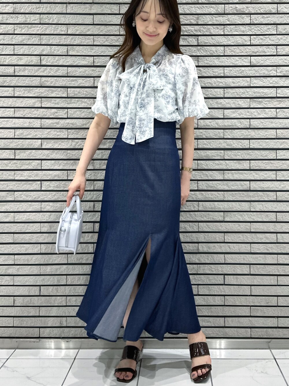 \白×ブルーの春夏らしい爽やかコーデ💙/ 白地にブルーのプリントブラウス× 深いインディゴカラーのマーメイドスカートが爽やかで お出かけにもオススメな大人可愛いコーデ🤍🎐 アイスブルーのスクエアバッグとブラウンの太ベルトサンダルで ちょっとレトロにまとめました♪ 【ブラウス】 伝統的な洋風壁紙をモチーフにしたオリジナルフラワープリントのブラウス。 ふんわりしたお袖が二の腕カバー効果も◎ 前後2WAYでロールカラーをフロントにするとスッキリと、 フロントリボンでフェミニンに着こなすこともできます👌 シフォン素材で透け感がありますが、 インナーキャミもセットになっています! 【スカート】 MERCURYDUO定番のマーメイド美シルエットスカート🧜🏻♀️ フロント切替の片側にはさり気ないスリットがあしらわれています。 バックレースアップデザインで後ろ姿も可愛く、 お好みのフィット感で着用ができるのがPOINT✔︎ 162㎝/Mサイズ着用で足首上の丈感です📏 【サンダル】 私の今季イチ推しリアルバイサンダル👡 太めのダブルベルトとエナメル素材がクラシカルでありながら、 まあるいクリアヒールがアクセントになっていて新鮮✨ 靴底だけでなくダブルベルト部分にもフカフカなクッションが入っていて、 足当たり最高で一日中疲れ知らずです! 足のサイズ23.5㎝で36サイズがピッタリでした👣