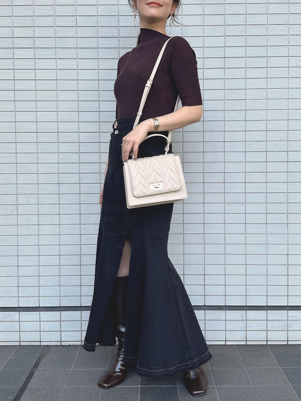 \お気に入りデニムスカートでちょっと辛口な秋コーデ🍁/ 今季1番のお気に入り♡ リアルバイしたデニムスカートのスリットから ロングブーツが見える着こなしをしたくて、 ちょっと辛口な大人カジュアルコーデを組んでみました! 次回はこちらに合わせるおすすめ羽織り合わせの コーディネートもご紹介します☺️ 【アイテム】 斜めカットのネックラインが特徴的な5分袖リブニット🧶 ビスチェ風に編地をさり気なく切替えた デザインもポイント♡ 前後2wayでフロントをシンプルに着こなすのも◎ 体のラインを拾いすぎない編地で モチっとした肌感触の良い一枚! 【スカート】 ラップデザイン・深めのスリットがポイントのデニムスカート💙 ストレッチがしっかりと効いたデニムを使用し、 女性らしいシルエットを強調したマーメイドがスタイルアップ効果◎ 控えめなダメージ・切っぱなし加工が カジュアルスタイルを大人っぽく楽しみたい方にピッタリ👌 162㎝/Mサイズ着用でくるぶし上くらいの丈感でした📏 【ブーツ】 今季イチの私のお気に入り・リアルバイブーツ👢 無駄のない・洗練ベーシックなシルエットに高級感があり、 濃いグレージュのような絶妙なカラーで ブラックよりも抜け感もありながら合わせやすい一足です! 歩きやすさ・安定感も過去のロングブーツで1番☝️ 甲・足幅標準で23.5㎝の私は36サイズがピッタリでした👣