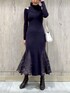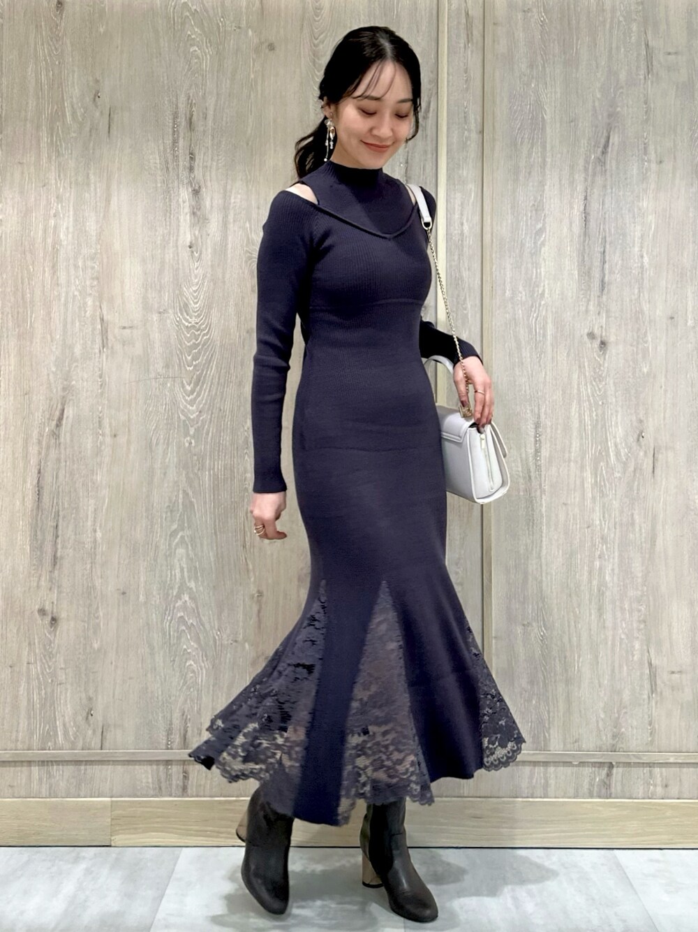 \大人上品に🩶きれいめニットワンピース✨💃🏼/ 女性らしいボディーラインを演出してくれしつつ、 とびきり大人上品なニットワンピが主役✨ 深みあるチャコールカラーのワンピに、 ゴールドアクセサリー・チェーンバックで 更に品格をプラス♡ デートにも女子会にも... バシッと大人っぽく決めたい時におすすめなコーデです☺︎ 【ワンピース】 美しいマーメイドシルエットが目を引くニットワンピ🧜🏻♀️ 裾レースの透け感・肩スリットの肌見せが 大人っぽいアクセントになってます✨ ピタッとした上身と裾マーメイドのコントラストで 歩き姿もドラマティックに♪♪💃🏼 きれいめワンピですが、柔らかくて伸縮性あるニット素材で 着心地抜群&数秒で着れてお着替えラクちん👏 162㎝/Mサイズ着用でふくらはぎ下の丈感でした📏 【シューズ】 私のお気に入りショートブーツ👢 バックシャンなヒールがPOINTで、 柔らかなストレッチレザー・安定感ヒールで疲れ知らずなところが推し♡ 23.5㎝/足の幅・甲が標準の私は36サイズがピッタリでした👣