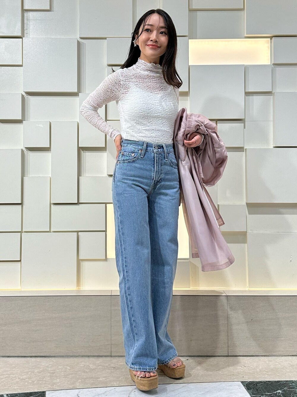 \大人フェミニン派のデニムコーデ👖/ トレンドのデニムコーデを MERCURYDUOらしく、大人フェミニンに♪ 【トップス】 表面感のあるストレッチレースが今年っぽいカットソー。 コンパクトですが伸縮性ある生地で、 動きやすいのが高POINT✔︎ トップスとしてはもちろん、フィットするので カーディガンやジャンスカワンピ等の インナー遣いにしても◎ 【パンツ】 リーバイス人気のシルエットRIBCAGEにトレンドのワイドレッグが 登場✨ 高い位置から緩く広がるシルエットが脚長効果◎ ウエスト〜ヒップにかけてはボディーラインに程よく沿い、 トップスのウエストイン・アウトも スッキリと決まります! ひとつあるとコーデの幅が拡がる優秀デニムです✨👖 【シューズ】 春夏MERCURYDUO定番の通称"神サンダル"👡 身長もスラっと見えて デザイン性も合わせやすさも軽さも歩きやすさも... 全部叶う欲張りサンダルです! 23.5㎝/足の幅・甲が標準の私は36サイズがピッタリでした👣