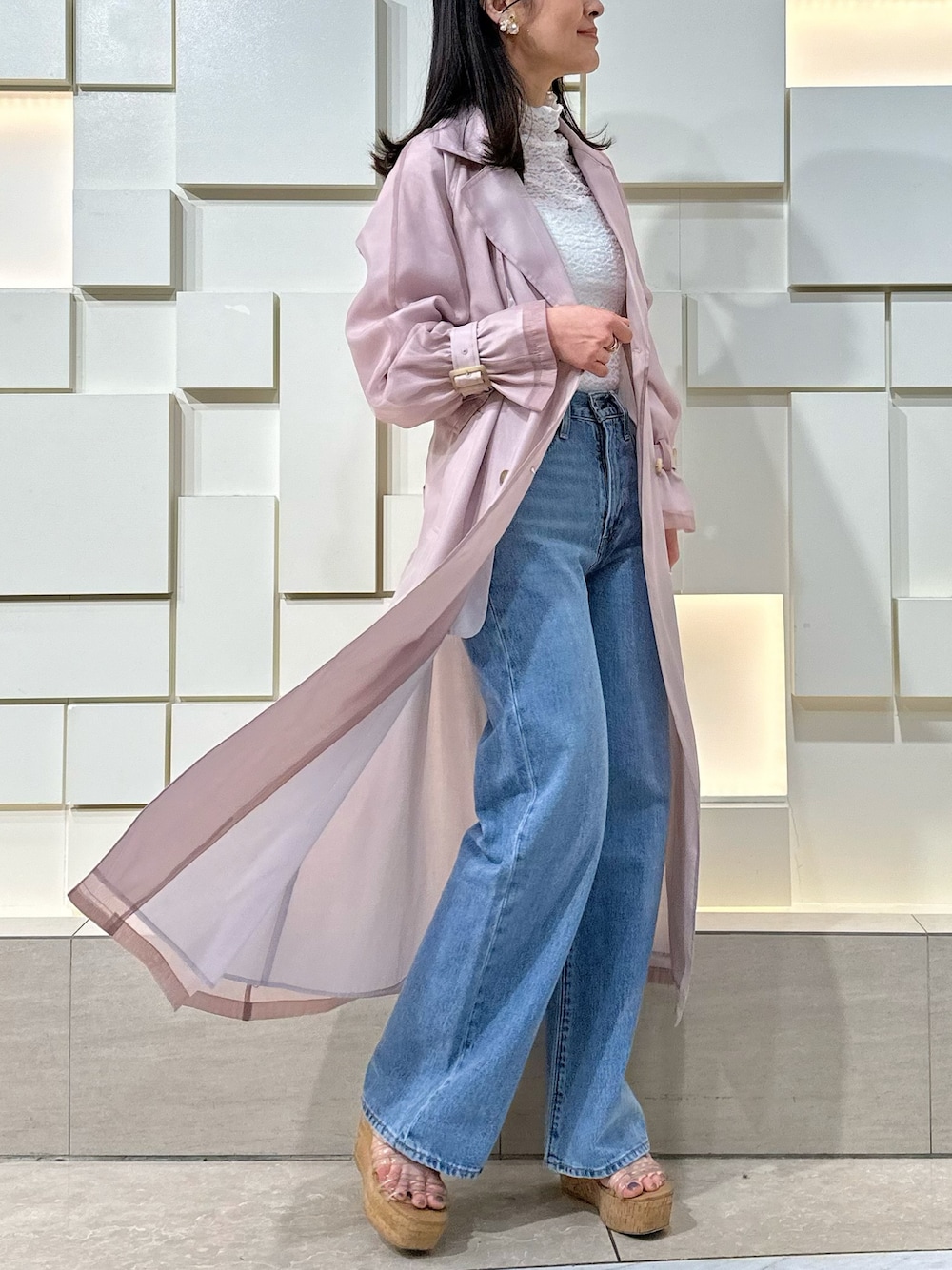 \カラートレンチ×ブルーデニムの王道大人カジュアルコーデ♡🧥👖/ 前回更新したデニムコーデに合わせる羽織りは、 こちらのトレンチコートがオススメ🙆♀️ (羽織り以外のお洋服の詳細は 前回stylingのコメントから✔︎) 【コート】 トレンドのオーガンジーを使用したロングトレンチコート🧥 しなやかに揺れる生地感が軽やかで春らしい印象♡ 動くたびにオーガンジーと裏地との 色の重なりが変わり、春の透け感を演出できます✨ ふんわり袖のベルトをキュッと締めて少し上げると、 手元が華奢に見え+涼やかに着こなせます♪ 162㎝/ Mサイズ着用で足首がしっかり見える丈感でした📏