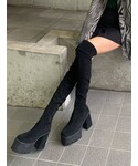 ブーツ合わせがかわいいミニワンピースが今年も入荷しました❤︎ ウエスト部分がシャーリング加工になっていて キュッと引き締めて見えるので、腰の位置が あがって見えスタイルアップ効果◎♩ ハイネックなのと、袖も肘まであり長めなのでワンピースでもフェミニンにならず、大人っぽく着ていただけます⭐︎バランスが気になる方は、ベルトを巻いていただくのもメリハリでるのでおすすめです❤︎ フレアパンツなどのパンツ合わせもかわいいです♩ 合わせたブーツは、毎年大大大人気のロングブーツ❤︎ストレッチ素材なので、引き締めももちろん、太ももまで伸ばしやすいサイハイブーツなので脚長抜群です!❤︎ヒールの高さは全サイズ11.5cmで、太めのヒールなので安定感もあり、履きやすいのも魅力的です♩丈感が気になる方は、上の部分を内側に折って履いたり、少し下げてクシュっとさせて履いていただいても◎です♩ハイウエストデニムと合わせたEMODAらしいスタイリングもおすすめです❤︎