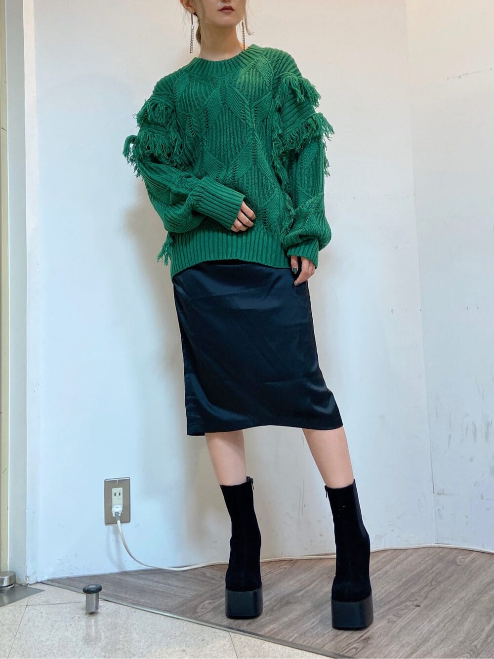 フリンジがかわいいデザインニット❤︎ ローゲージなので1枚で存在感があり、シンプルなコーデのポイントにもなります♩あたたかく優しい印象なので、9月〜冬まで長く着ていただけますよ❤︎ 見た目に比べて厚手すぎず、軽いので着心地も◎です!チクチク感もないので、ストレスなく着れるのもおすすめポイントです❤︎ 少し透け感があるので、インナーと一緒に着ていただくのがベストです⭐︎ オーバーサイズなのですが、二の腕部分とサイドにフリンジを施しているので全体のラインがキレイに見えるようなつくりになってます⭐︎身長156cmの私で、ヒップが少し隠れる丈感なので、タイトなボトムスで合わせていただくとすっきりして見え、モードなイメージで着ていただけるのでおすすめです⭐︎ 私は、フレアスカートで大人ぽく合わせてみました❤︎光沢感のある生地で、サイドのギャザーがすっきりとタイトに見せてくれるので女性らしいシルエットで着ていただけます♩ブーツで合わせていただくのがおすすめですが、ローファーにソックススタイルも可愛いです♩ 履いてるサイドゴアブーツは、EMODA定番の厚底ブーツ❤︎前底もあるので安定感◎です♩ヒールは全サイズ11.7cmあるので、美脚効果抜群でどんなボトムスにも合わせていただきやすいです❤︎ サイドゴアなのですが、内側はチャックなので履きやすさも◎❤︎今年らしく、少し丈感が長めに作られてるのもポイントです⭐︎ 定番のブラックと、EMODAおすすめのカモフラ柄も可愛いので、ぜひチェックしてみてください❤︎